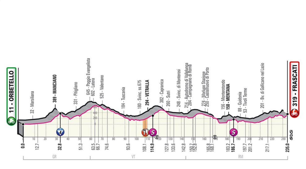 Eng laang Etapp, bei där sech 3 Leit un d’Spëtzt gesat hunn. Si sollten awer net duerchkommen, esou datt d’Sprinterekippen zum Schluss un der Spëtzt dominéiert hunn. Dat awer just bis 6 Kilometer viru Schluss, wou eng Chutte aus dem Peloton vill kleng Gruppe gemaach hunn. Am éischte Grupp, wou och de Maglia rosa dra war, konnt sech de Richard Carapaz duerchsetzen.