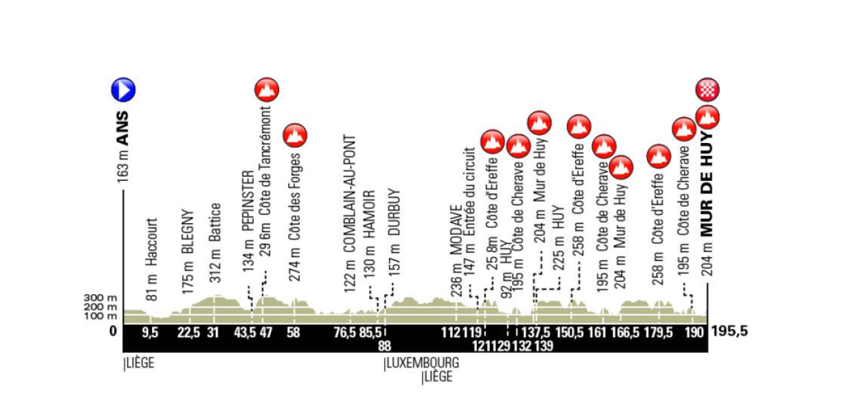 E Mëttwoch de Mëtte goung et bei der Flèche Wallonne iwwer 195 Kilometer vun Ans op d’Mur de Huy. Eigentlech leien tëscht Ans a Huy nëmme 26 Kilometer, ma d’Cycliste mussen ee groussen Ëmwee maachen an dobäi musse si direkt e puer gëfteg Koppen hannert sech bréngen. Eleng d’Kombinatioun Côte d’Ereffe, Côte de Cherave a Mur de Huy gëtt dräimol gefuer. De groussen Highlight ass dann uewen op der Mur de Huy. Déi legendär Mur de Huy ass zwar nëmmen 1,3 Kilometer laang, dofir am Duerchschnëtt 9,6% géi. Bleift awer nach ze betounen, dass d’Mur de Huy eng maximal Steigung vun 19% huet.