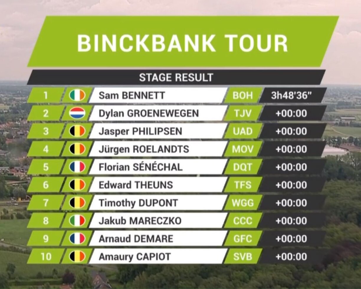 3 Kilometer virun der Arrivée ass dunn nees alles zesummegelaf an och wann et am Uschloss nach déi eng oder aner Attack gouf, esou koum et schlussendlech nawell zu engem Massesprint an do war et ganz ganz enk, ma um Enn war et de Sam Bennett, deen e puer Millimeter Avance op den Dylan Groenewegen hat. Fir de Sam Bennett ass et déi drëtt Victoire op der drëtter Etapp.