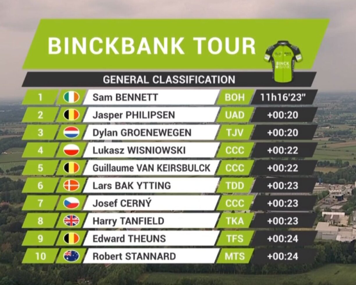 Am General hunn den Alex Kirsch, de Jempy Drucker an de Bob Jungels 30 Sekonne Retard op de Leader Sam Bennett. Si stinn op de Plaze 67, 80 a 94. De Kevin Geniets ass den 126. op 3 Minutten an 9 Sekonnen.