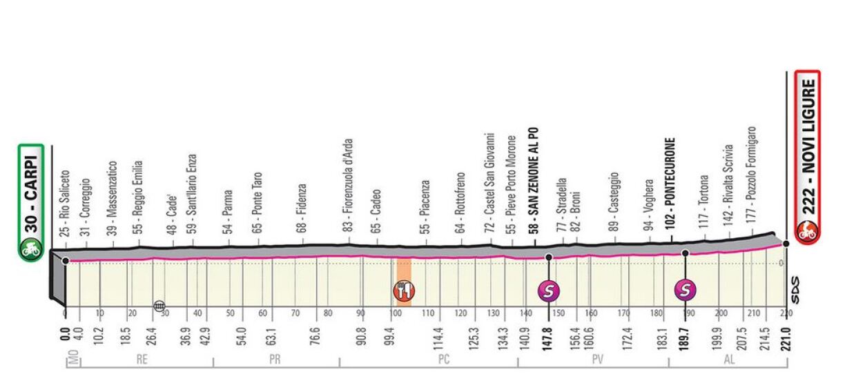 221 ganz flaach Kilometer stoungen um Programm, wéi et vu Capri op Novi Ligure gaangen ass.