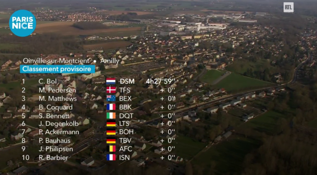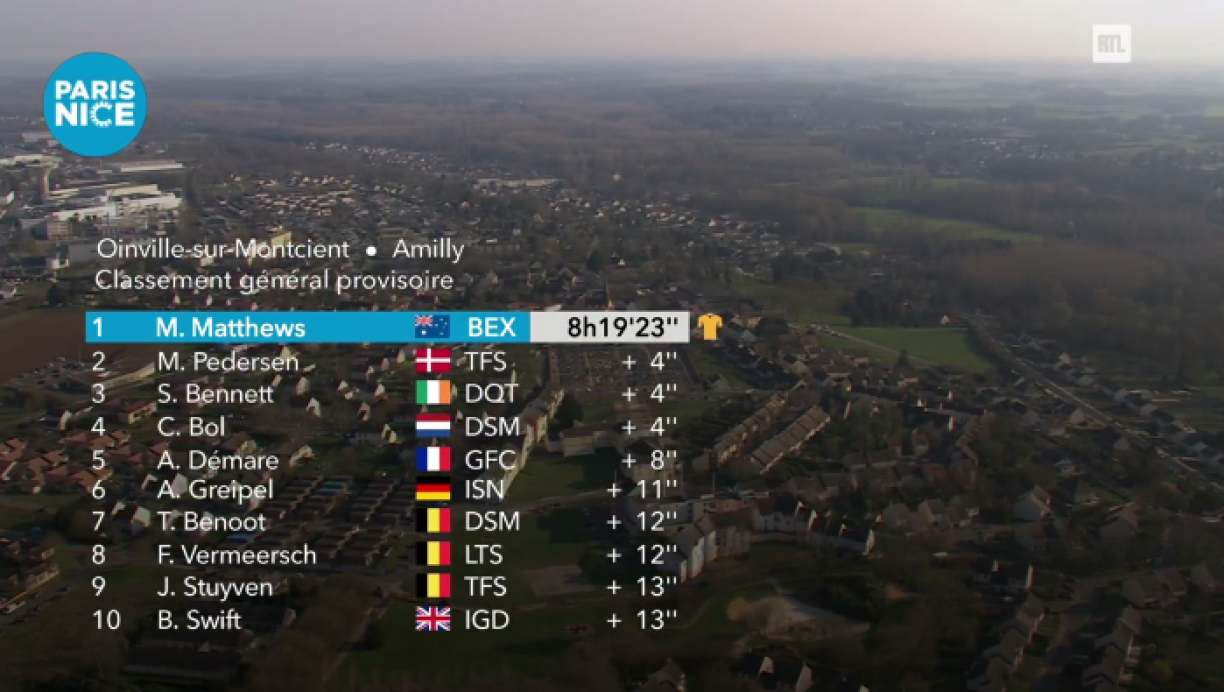 Neie Leader am General ass de Michael Matthews. Den Australier läit 4 Sekonne virum Mads Pedersen an dem Sam Bennett. De Bob Jungels ass de 70. op 14 Sekonnen. Den Alex Kirsch läit op der 145. Plaz an huet e Retard vun zwou Minutten an 31 Sekonnen.