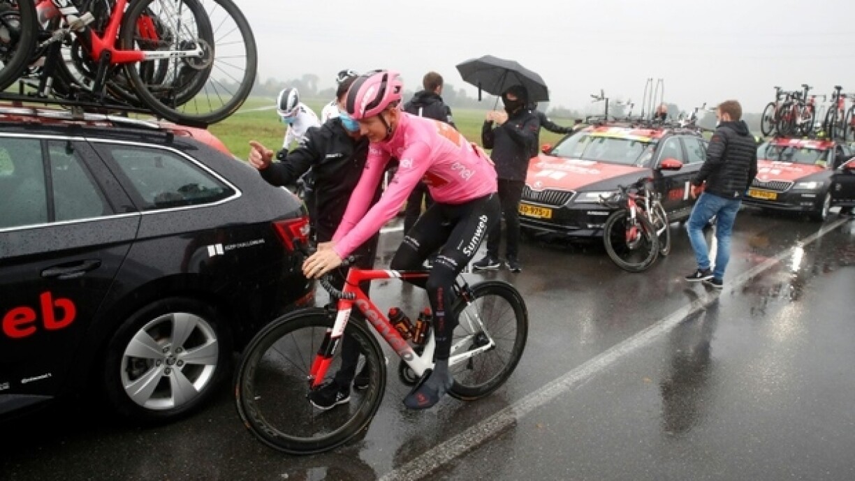 D’Coureuren hu protestéiert, nodeems fir d’Regioun an der Lombardei ganz staarke Reen gemellt ass. Den neien Depart gouf an den Norde vu Mailand verluecht.