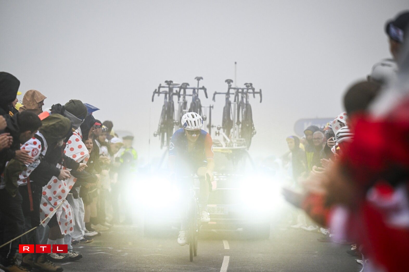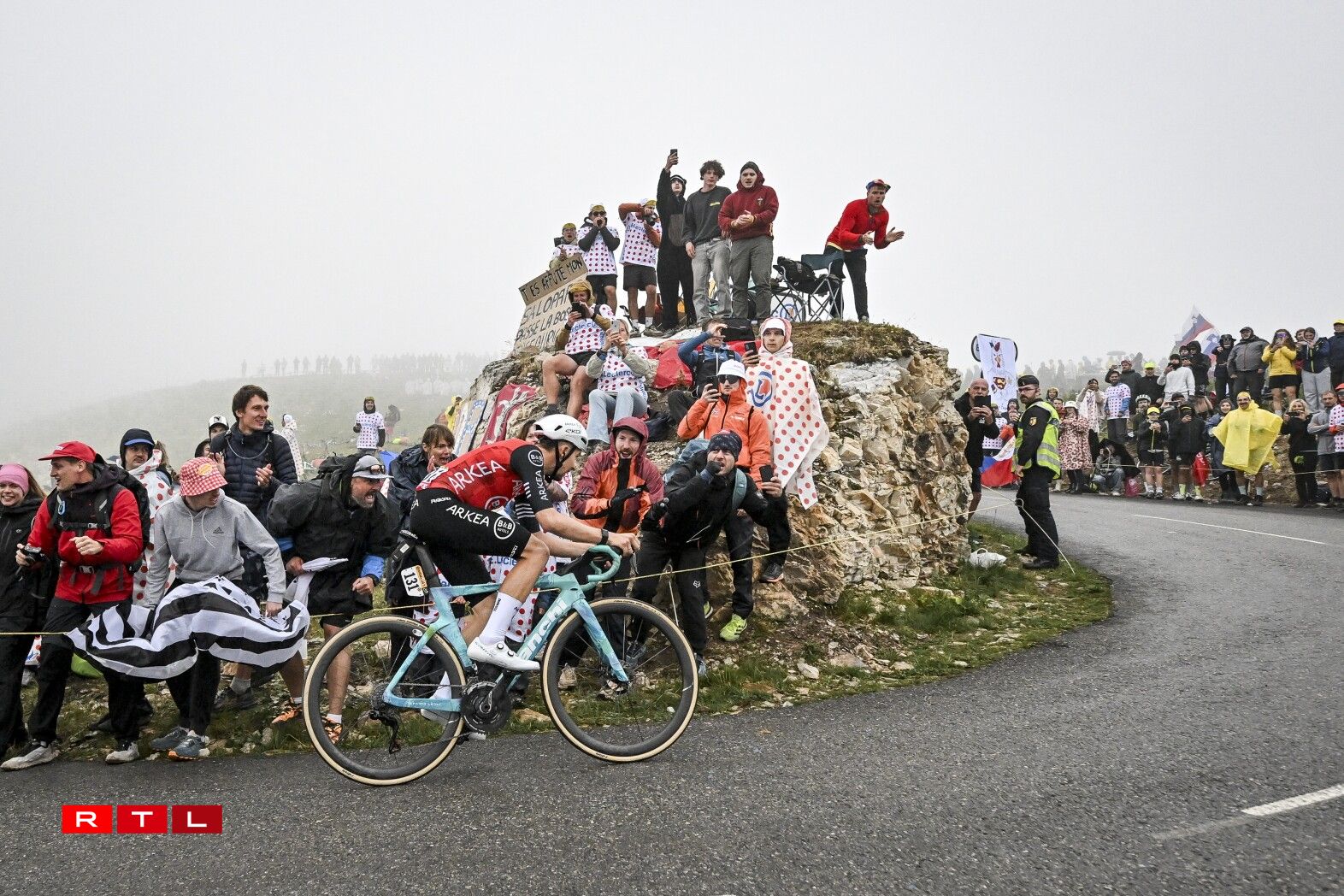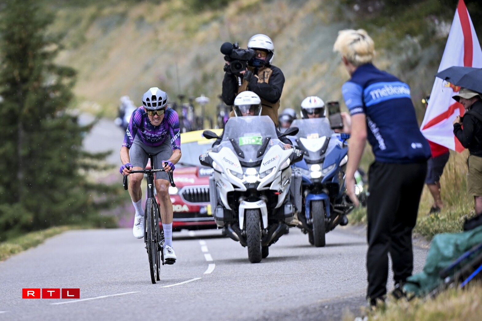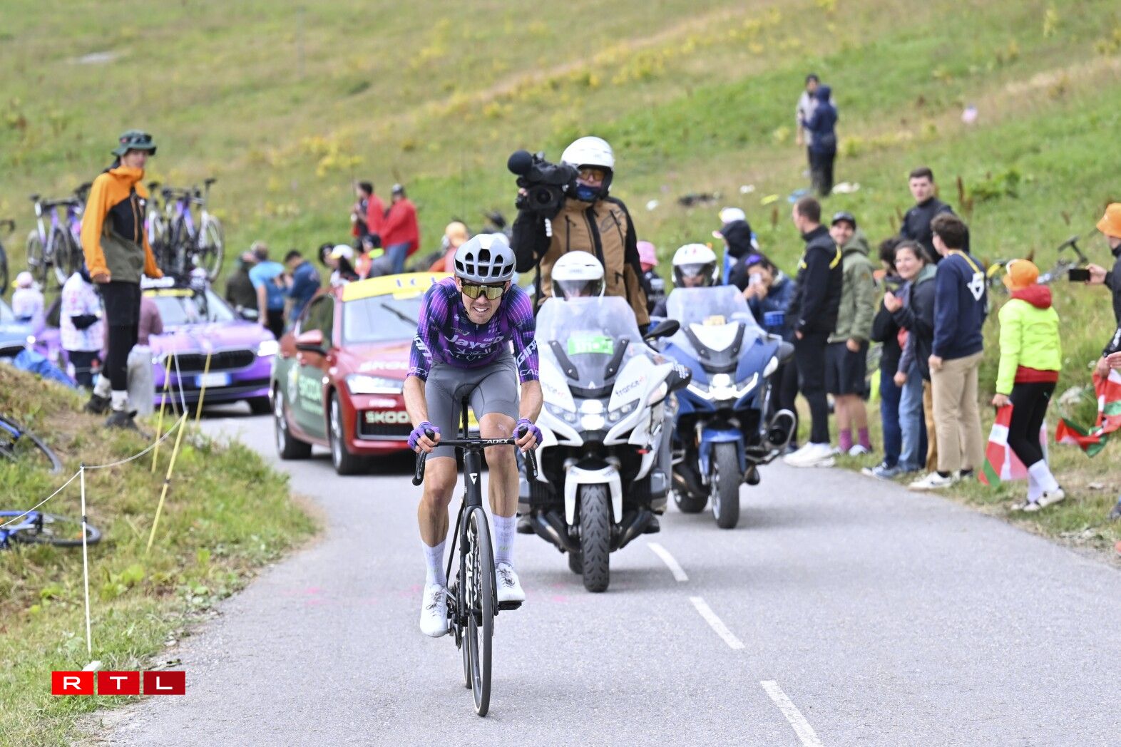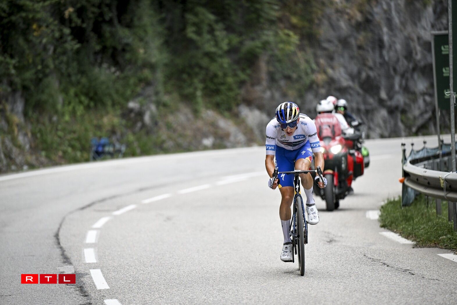 Erop op de Col de la Loze huet de Matteo Jorgensen 24 Kilometer virun der Arrivée aus dem Spëtzegrupp musse lass loossen. 20 Kilometer virum wäisse Stréch ass de Lipowitz op de Jorgensen opgefuer, fir e puer Kilometer méi spéit den US-Amerikaner stoen ze loossen. 16 Kilometer virun der Arrivée huet den O’Connor de Rubio stoe gelooss an 8 Kilometer virum Sommet ass de Lipowitz vum Grupp Maillot Jaune nees agefaange ginn. Deen Ament hat den O’Connor eng Avance vun 3 Minutten a 15 Sekonnen op de Pogacar an déi aner Favoritte fir de General.