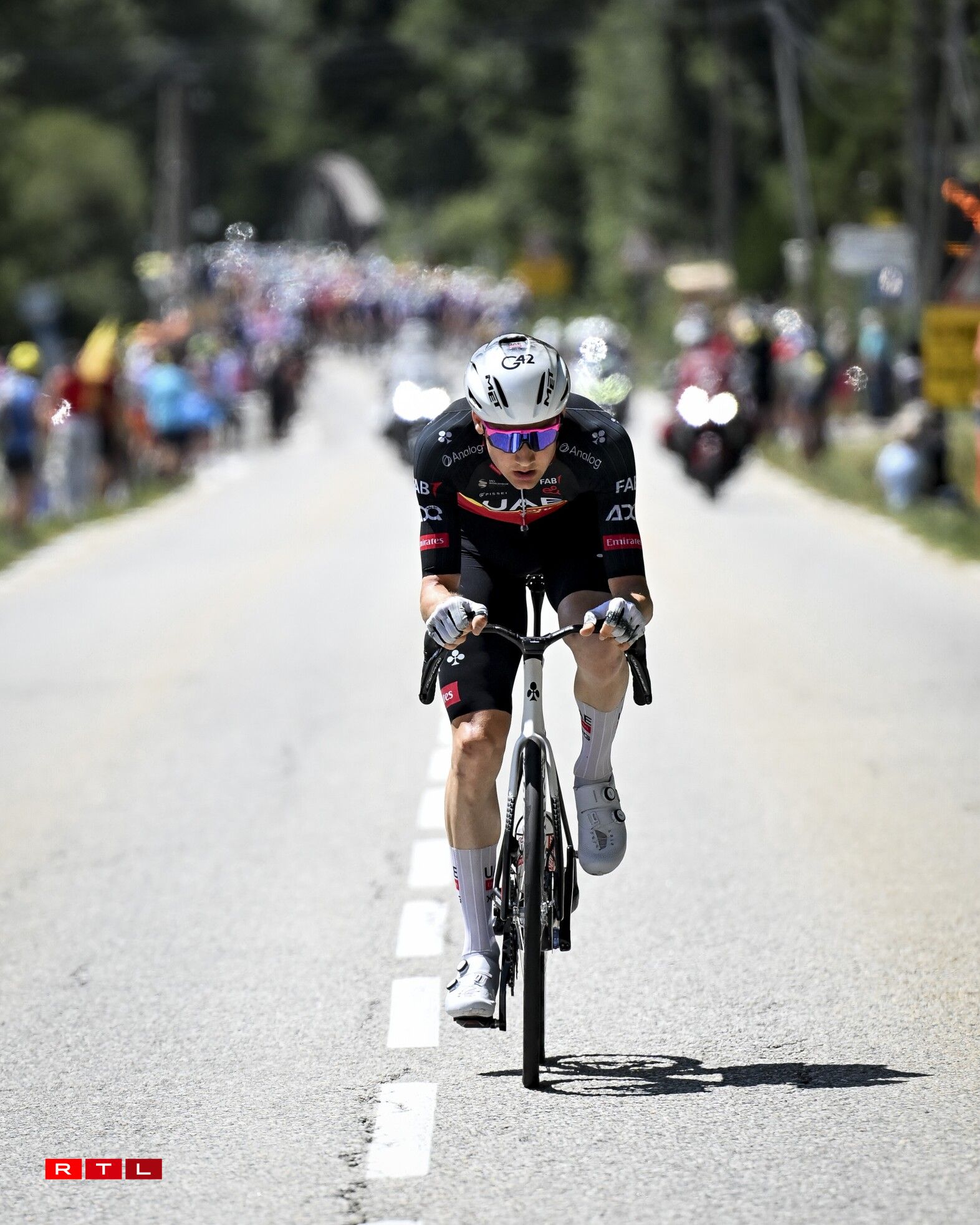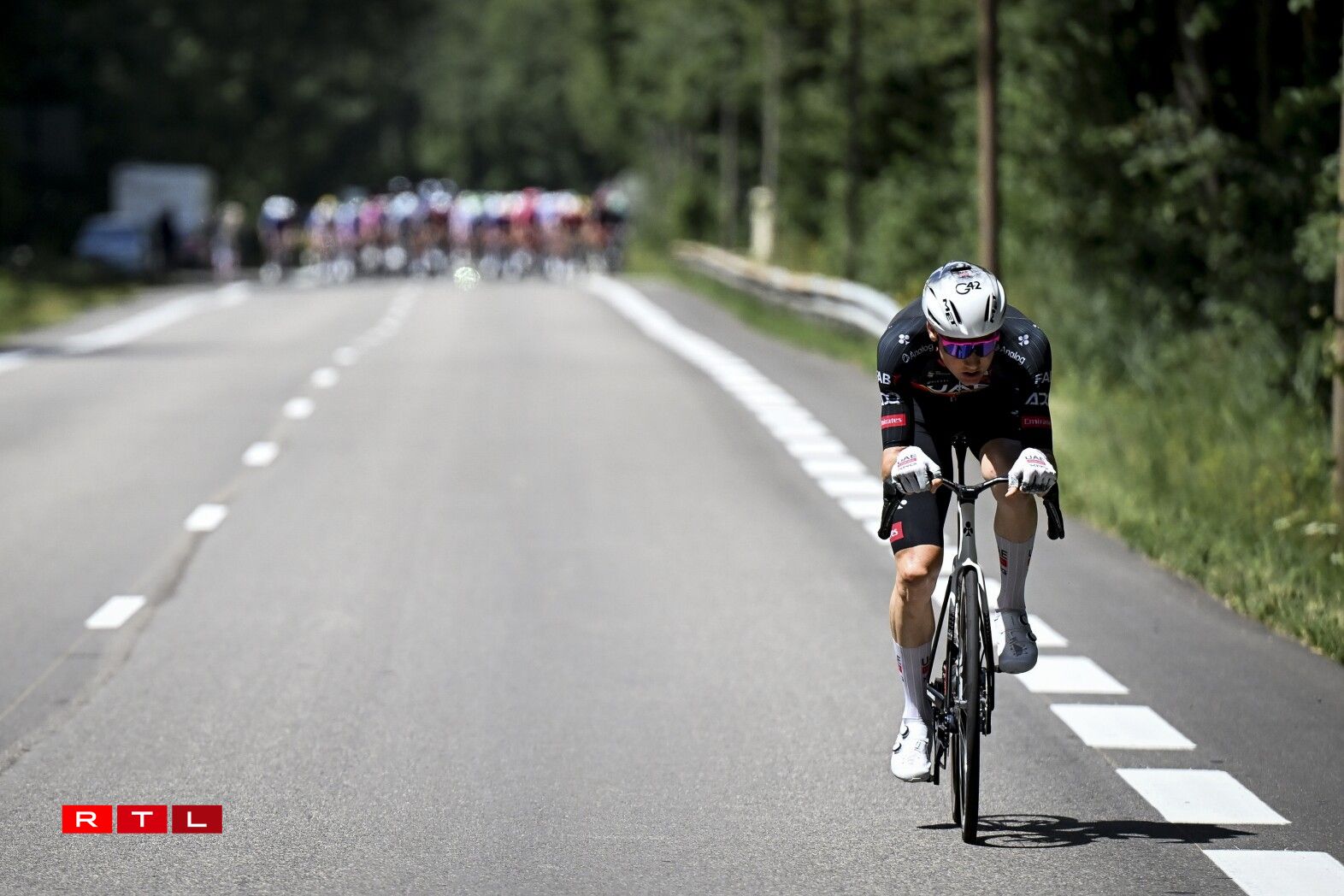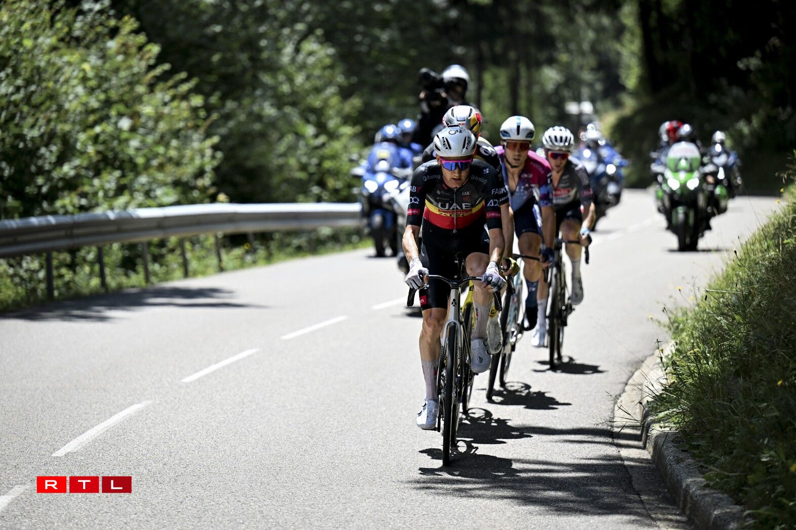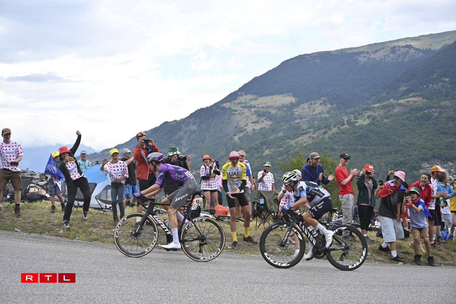 An der Descente Richtung Fouss vum Col de la Madeleine ass d’Echappée auseneegefuer an de Thymen Arensman an den Matteo Jorgenson sinn eleng vir bliwwen. Mat ronn 30 Sekonnen op de Grupp Roglic sinn déi zwee an Montée erop op 2.000 Meter gaangen. De Roglic zesumme mat eng hallwer Dosen anere Coureuren ass eng 13 Kilometer virum Sommet awer nees bei déi zwee Leit un der Spëtzt bäigefuer. Am Grupp Maillot Jaune huet Visma - Lease A Bike acceleréiert an ëmmer méi Leit konnten deen Train net méi matgoen. 4,5 Kilometer virum Sommet, huet den Jonas Vingegaaard eng éischte Kéier attackéiert. De Pogacar konnt awer a sengem Rad bleiwen. Den 3. am General Florian Lipowitz huet awer musse lassloossen. Kuerz drop si Vingegaard a Pogacar bei de Spëtzegrupp bäigefuer. De Grupp ronderëm de Maillot Jaune hat uewen um Col de la Madeleine eng Avance vu 30 Sekonnen op de Florian Lipowitz. An der Descente huet de Ben O’Connor attackéiert a just de Matteo Jorgensen an den Einer Rubio sinn nogesprongen. Pogacar a Vingegaard hunn dat net gemaach an dat huet et dem Lipowitz nees erlaabt, béi dee Grupp bäizefueren. E puer Kilometer méi spéit huet den Däitschen aus dem Grupp Maillot Jaune eraus attackéiert a konnt sech och virun der Montée erop op de Col de la Loze tëscht dem Spëtzegrupp an dem Grupp ronderëm de Pogacar positionéieren. Dee Grupp ass ëmmer méi grouss ginn, well eng Partie Coureuren nees vun hannen bei Pogacar a Co opschléisse konnten.
