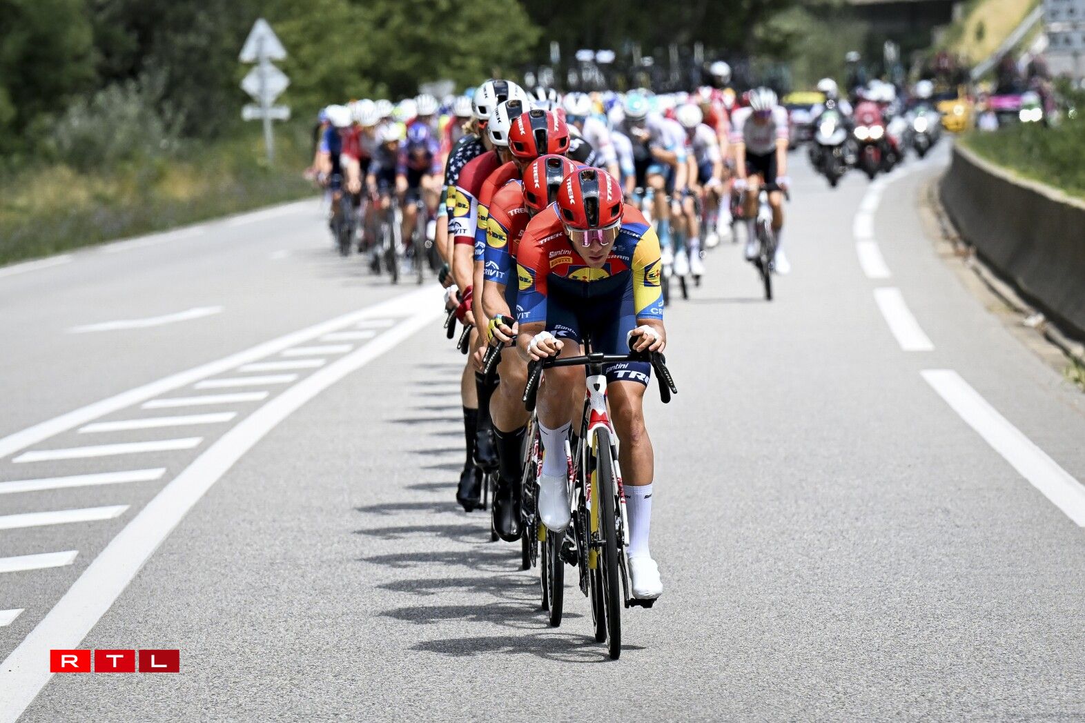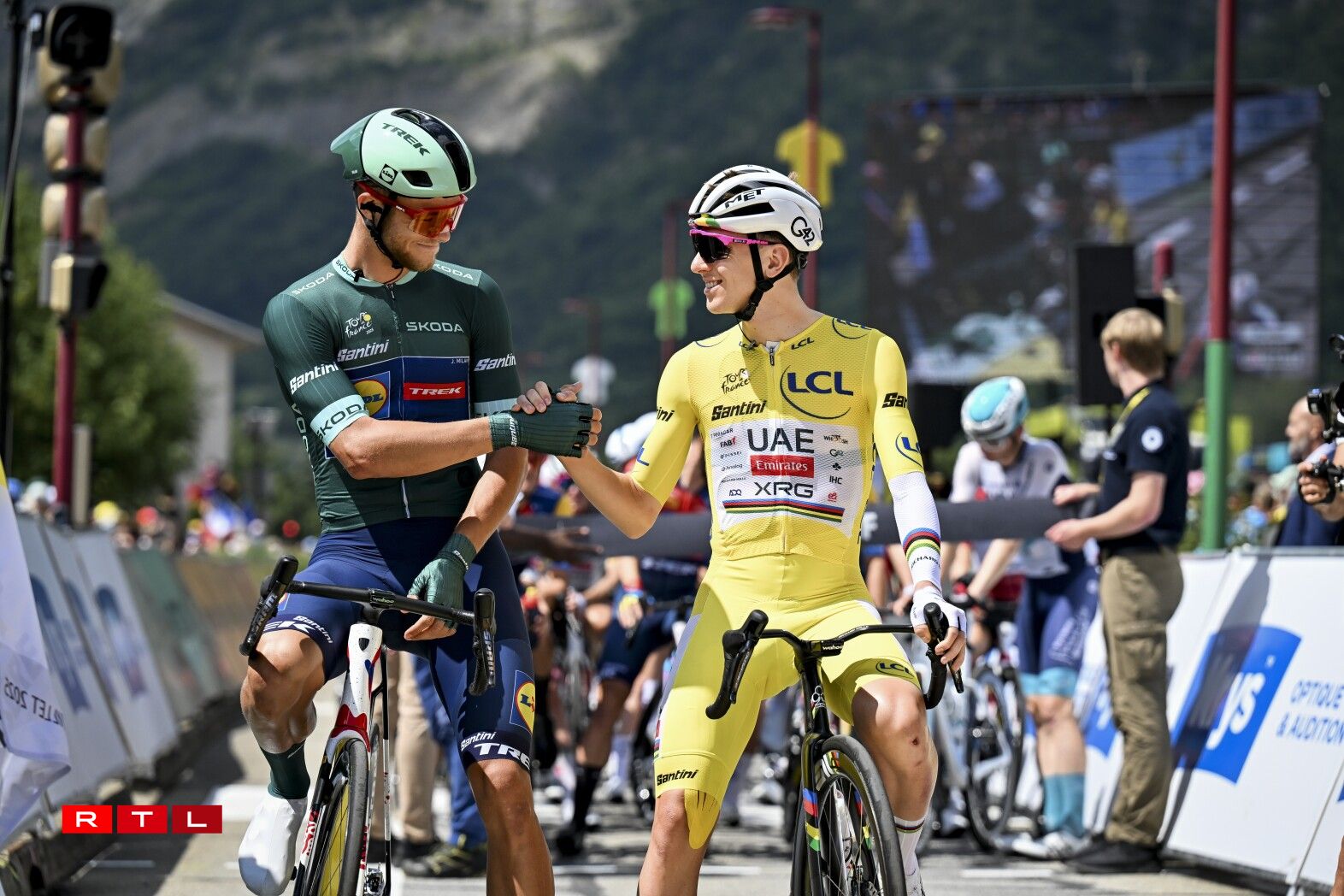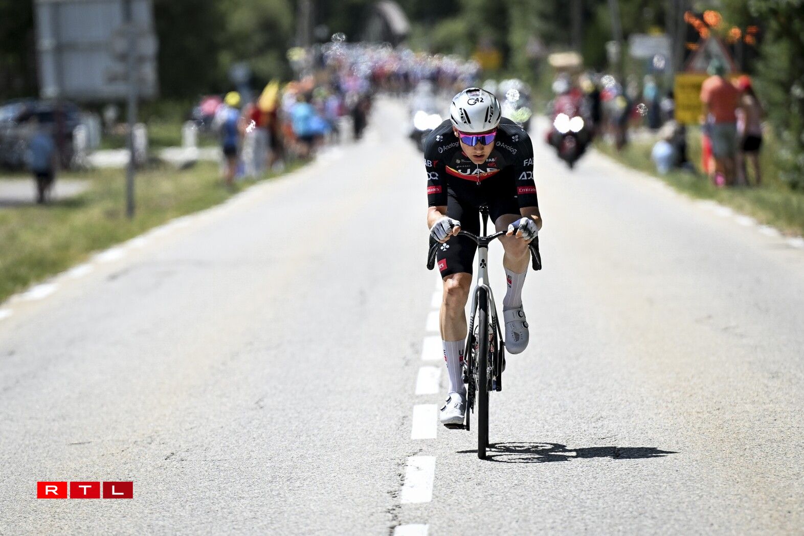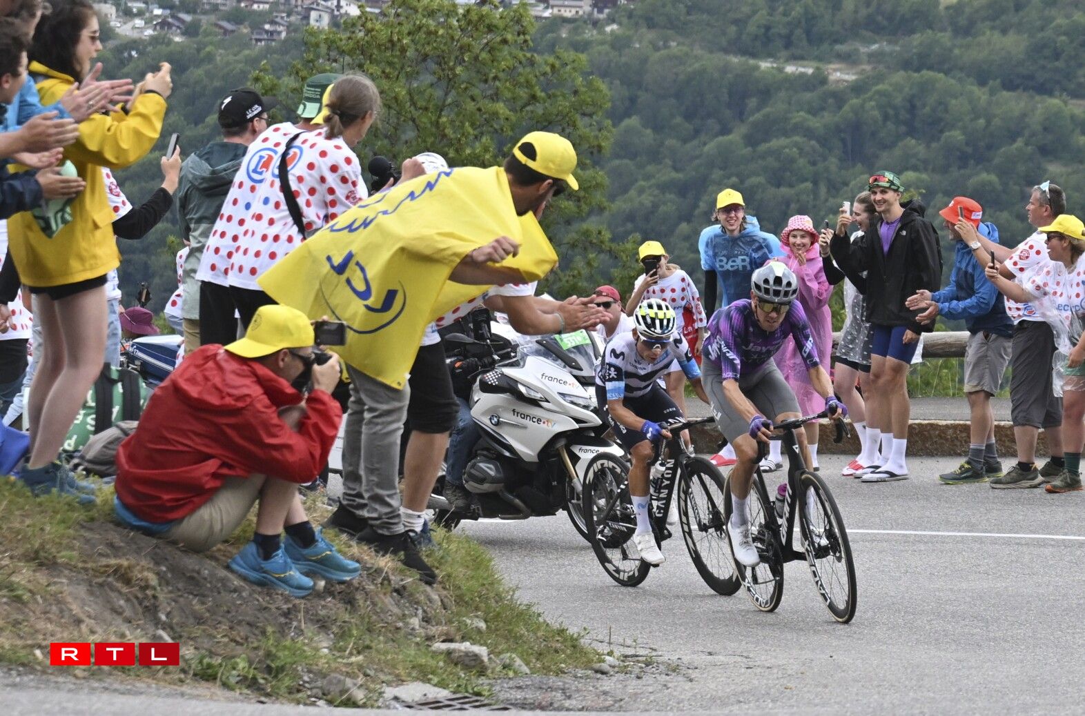 An der Descente Richtung Fouss vum Col de la Madeleine ass d’Echappée auseneegefuer an de Thymen Arensman an den Matteo Jorgenson sinn eleng vir bliwwen. Mat ronn 30 Sekonnen op de Grupp Roglic sinn déi zwee an Montée erop op 2.000 Meter gaangen. De Roglic zesumme mat eng hallwer Dosen anere Coureuren ass eng 13 Kilometer virum Sommet awer nees bei déi zwee Leit un der Spëtzt bäigefuer. Am Grupp Maillot Jaune huet Visma - Lease A Bike acceleréiert an ëmmer méi Leit konnten deen Train net méi matgoen. 4,5 Kilometer virum Sommet, huet den Jonas Vingegaaard eng éischte Kéier attackéiert. De Pogacar konnt awer a sengem Rad bleiwen. Den 3. am General Florian Lipowitz huet awer musse lassloossen. Kuerz drop si Vingegaard a Pogacar bei de Spëtzegrupp bäigefuer. De Grupp ronderëm de Maillot Jaune hat uewen um Col de la Madeleine eng Avance vu 30 Sekonnen op de Florian Lipowitz. An der Descente huet de Ben O’Connor attackéiert a just de Matteo Jorgensen an den Einer Rubio sinn nogesprongen. Pogacar a Vingegaard hunn dat net gemaach an dat huet et dem Lipowitz nees erlaabt, béi dee Grupp bäizefueren. E puer Kilometer méi spéit huet den Däitschen aus dem Grupp Maillot Jaune eraus attackéiert a konnt sech och virun der Montée erop op de Col de la Loze tëscht dem Spëtzegrupp an dem Grupp ronderëm de Pogacar positionéieren. Dee Grupp ass ëmmer méi grouss ginn, well eng Partie Coureuren nees vun hannen bei Pogacar a Co opschléisse konnten.