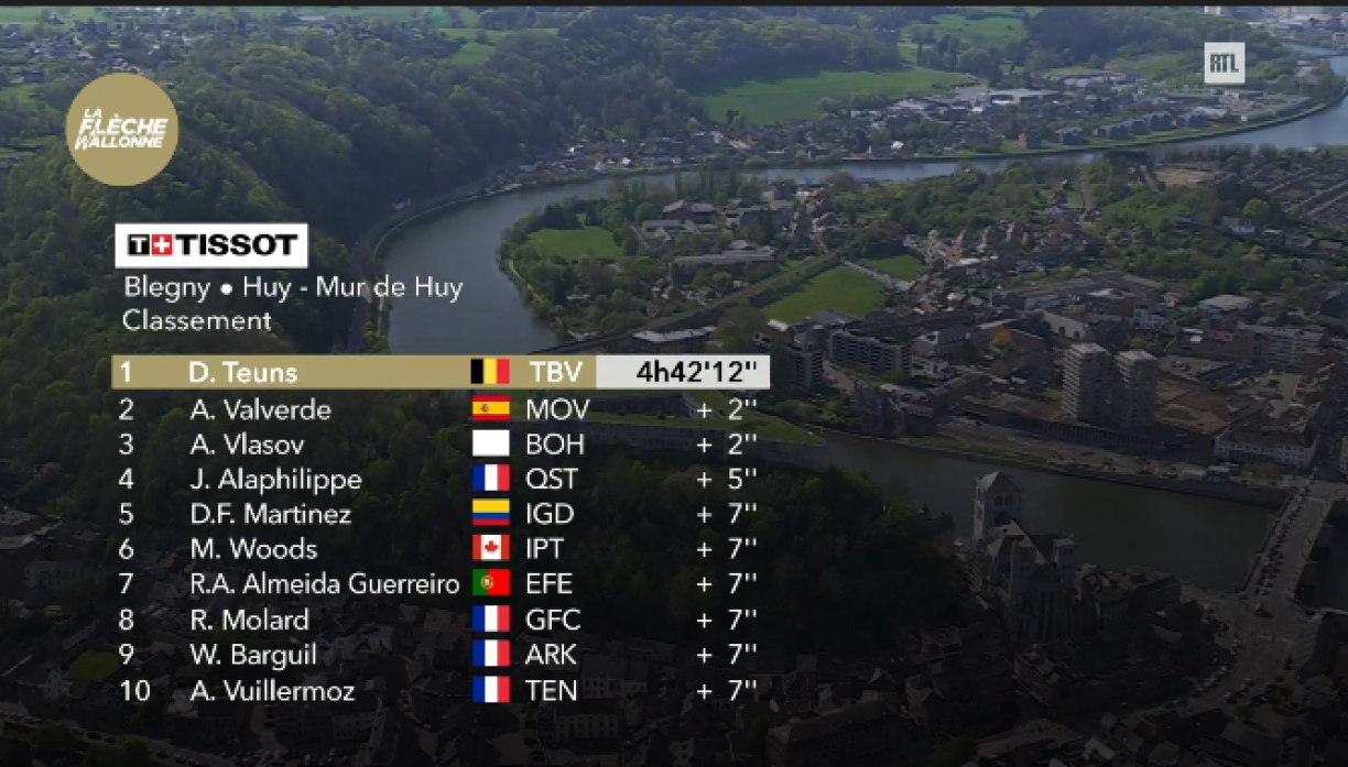 Ëmmer erëm hu Coureuren, déi sech keng Chance ausgerechent hunn, fir d’Mur de Huy am Peloton ze gewannen, probéiert, fir sech an de leschte Kilometer. Zwee Coureure hate sech en Avantage an der leschter Descente erausgefuer an de Peloton huet misste méi séier ginn, wat dozou gefouert huet, datt de Peloton ausernee gebrach ass. Ma knapp ware si an d’Mauer eragefuer, war de klengen Ecart vun der Echappée scho fort. De séieren Tempo konnte vill Coureuren net matgoen, esou datt nach just e puer vun hinnen ëm d’Victoire konnte matsprinten. Déi beschte Been hat den Dylan Teuns, dat virum Alejandro Valverde an dem Aleksandr Vlasov.