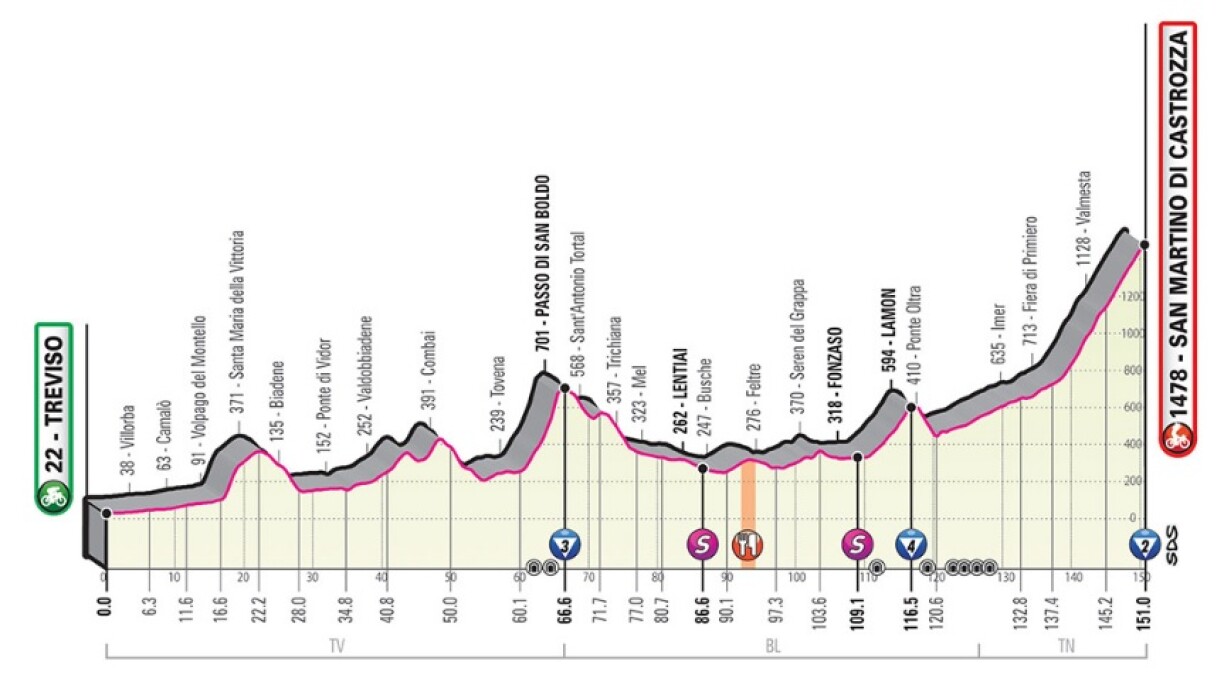 Um Freideg huet mat der Arrivée uewenaus zu San Martino di Castrozza eng Biergarrivée op d’Cycliste gewaart. Zwou weider Schwieregkeeten huet de Peloton missen an Ugrëff huelen, dat mat dem Passo di San Boldo, ee Col vun der 3. Kategorie, a mat der Ponte Oltra, ee Bierg vun der 4.