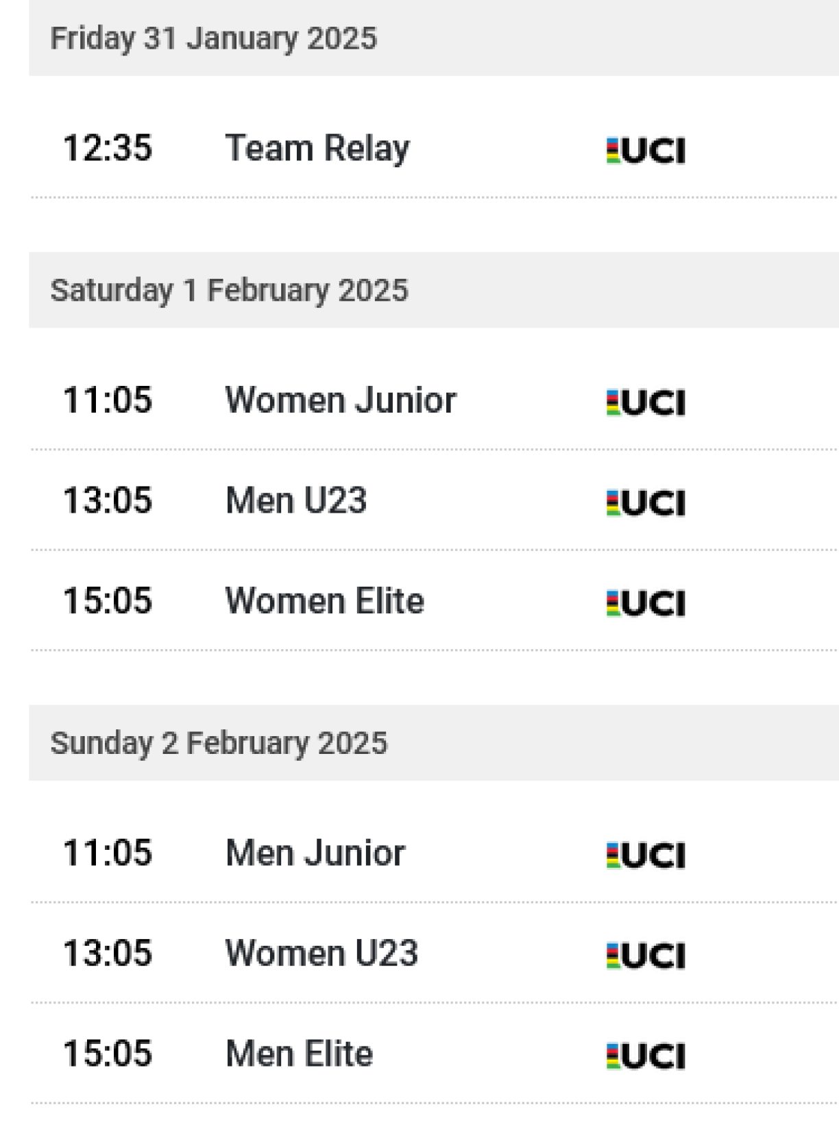 Och e Sonndeg ginn dräi nei Weltmeeschter gesicht. Moies um 11.05 Auer sinn d’Junior-Männer un der Rei. Dës Kategorie ass staark besat an et kommen eng gutt 10 bis 12 Coureuren a Fro, déi um Enn jee no Dagesform kënne mat ëm den Titel fueren. Aus Lëtzebuerger Siicht hat de Lennox Papi leschte Weekend zu Hoogerheide an Holland mat enger staarker 25. Plaz iwwerzeegt. De Jonah Flammang Lies war 36. Fir béid Coureure war et dat bis elo beschte Resultat an engem Weltcup-Cross.
