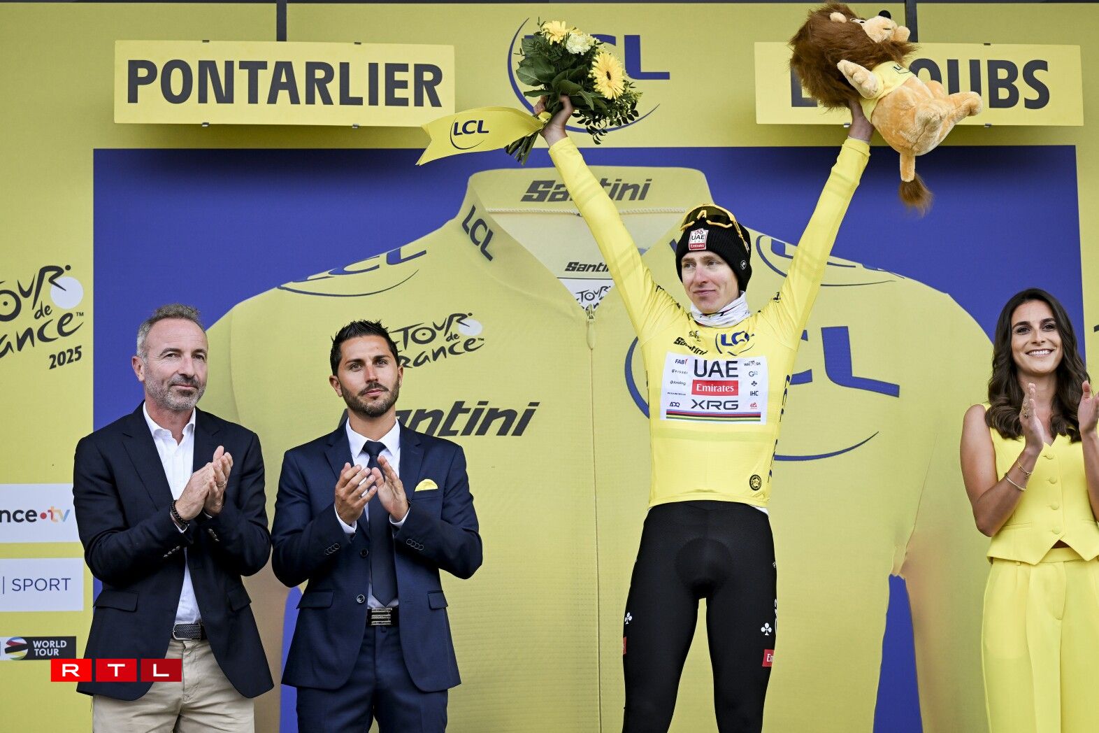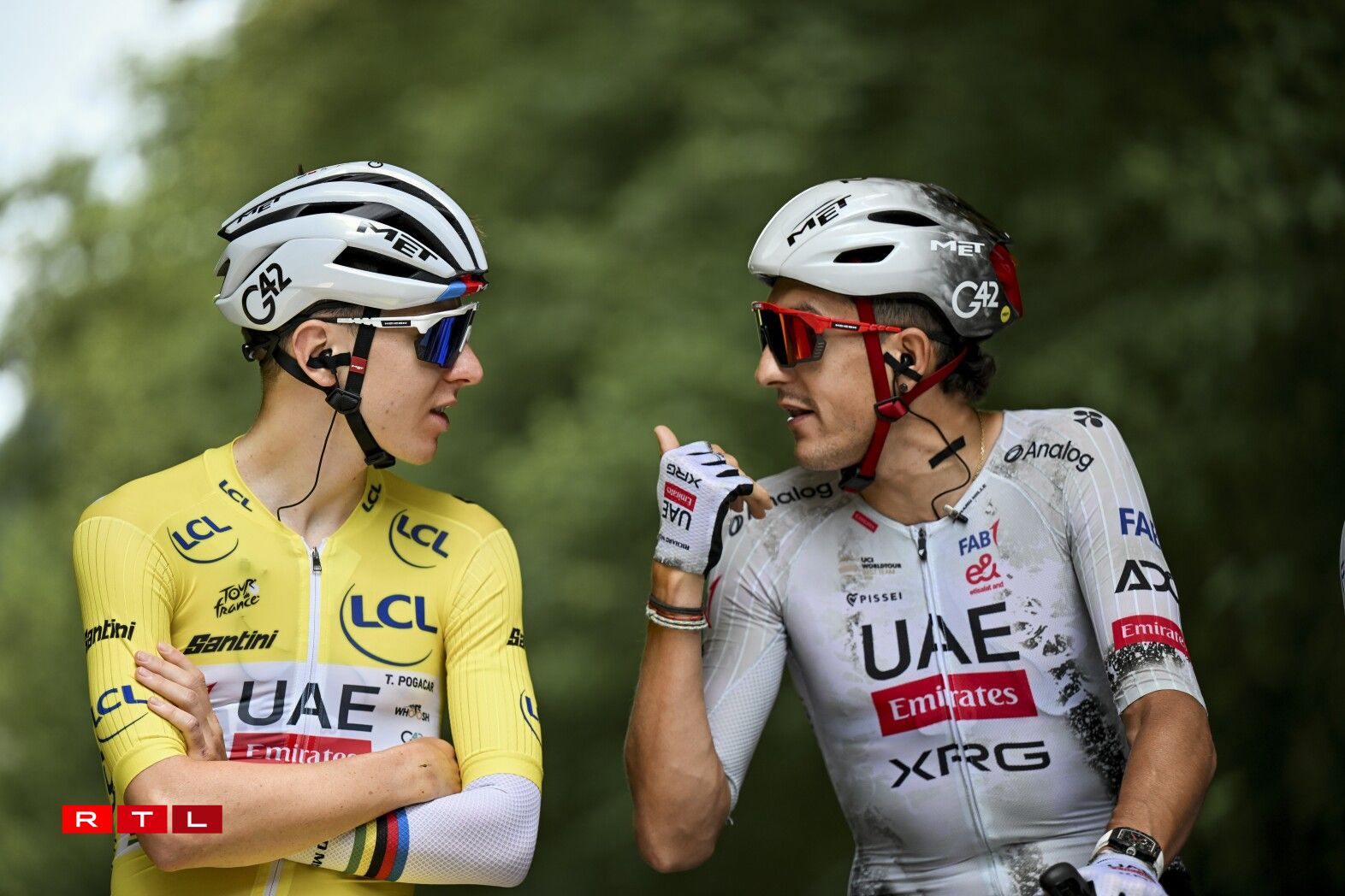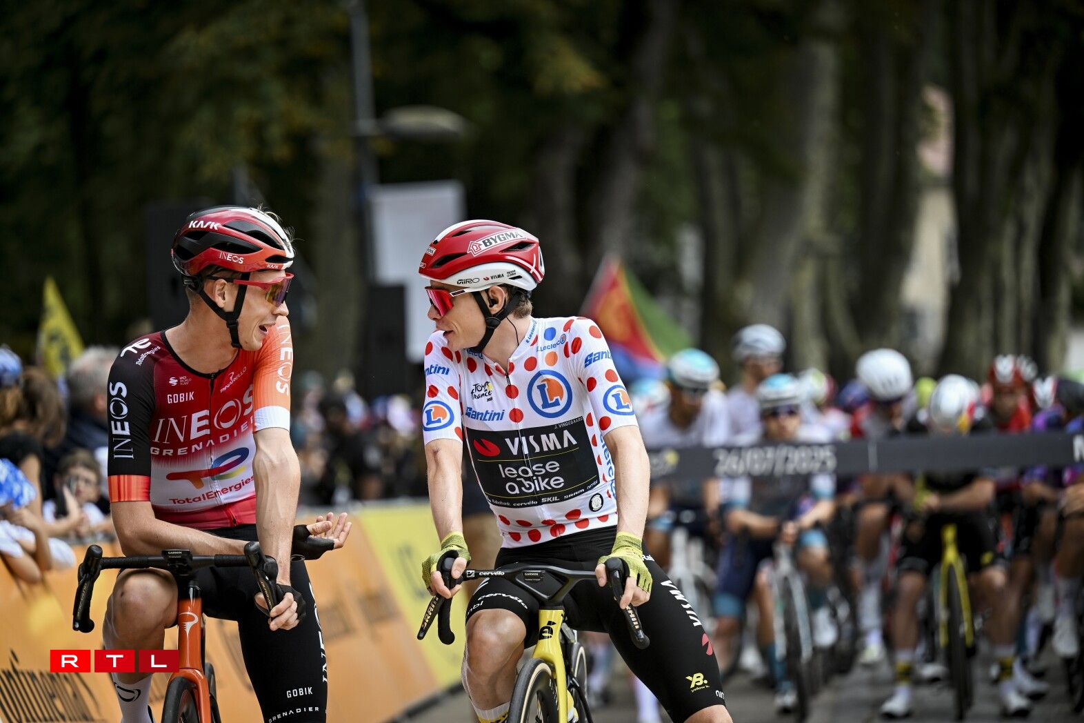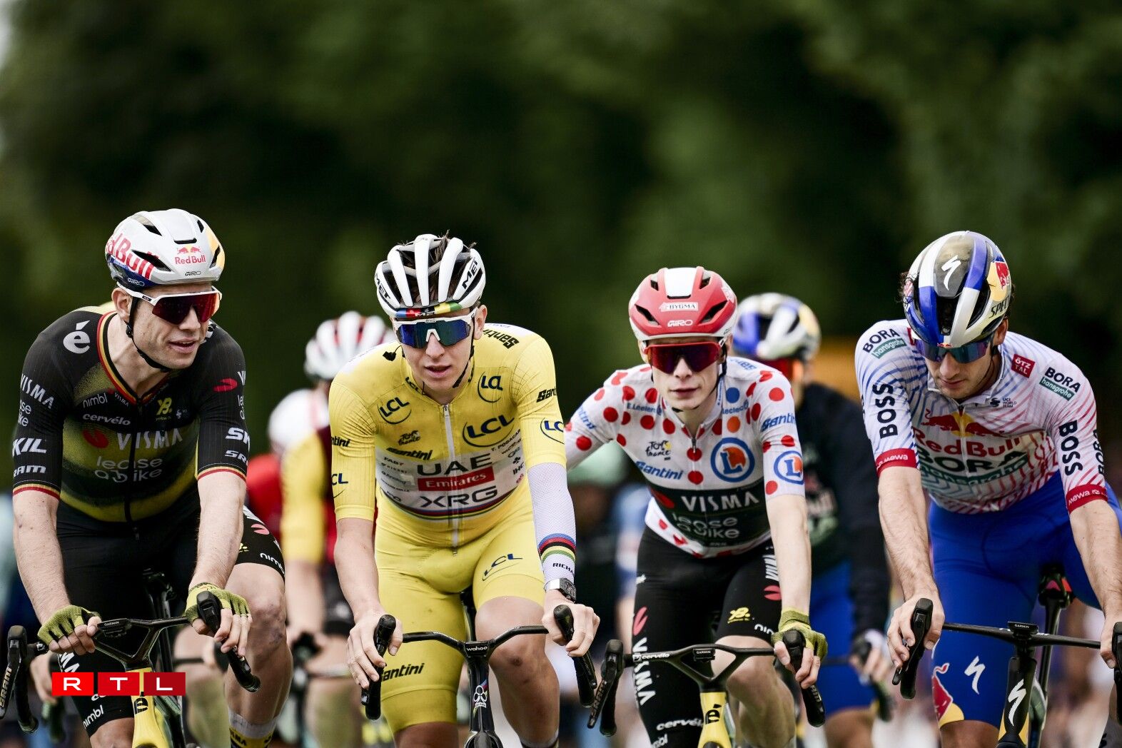 Den Tadej Pogacar steet domadder viru senger véierter Schlussvictoire. Virun der leschter Etapp huet hien eng Avance vu véier Minutten a 24 Sekonnen op de Jonas Vingegaard an eelef Minutten an néng Sekonnen op de Florian Lipowitz.