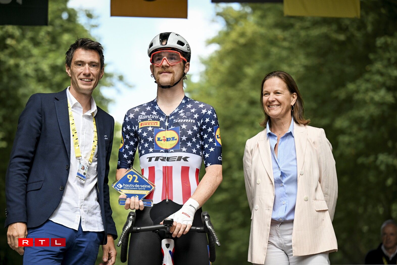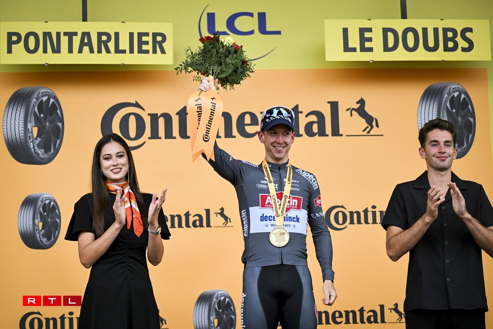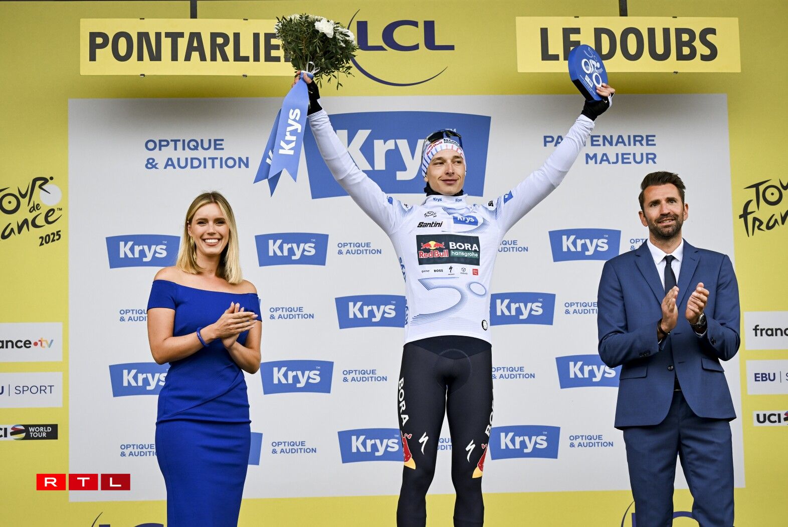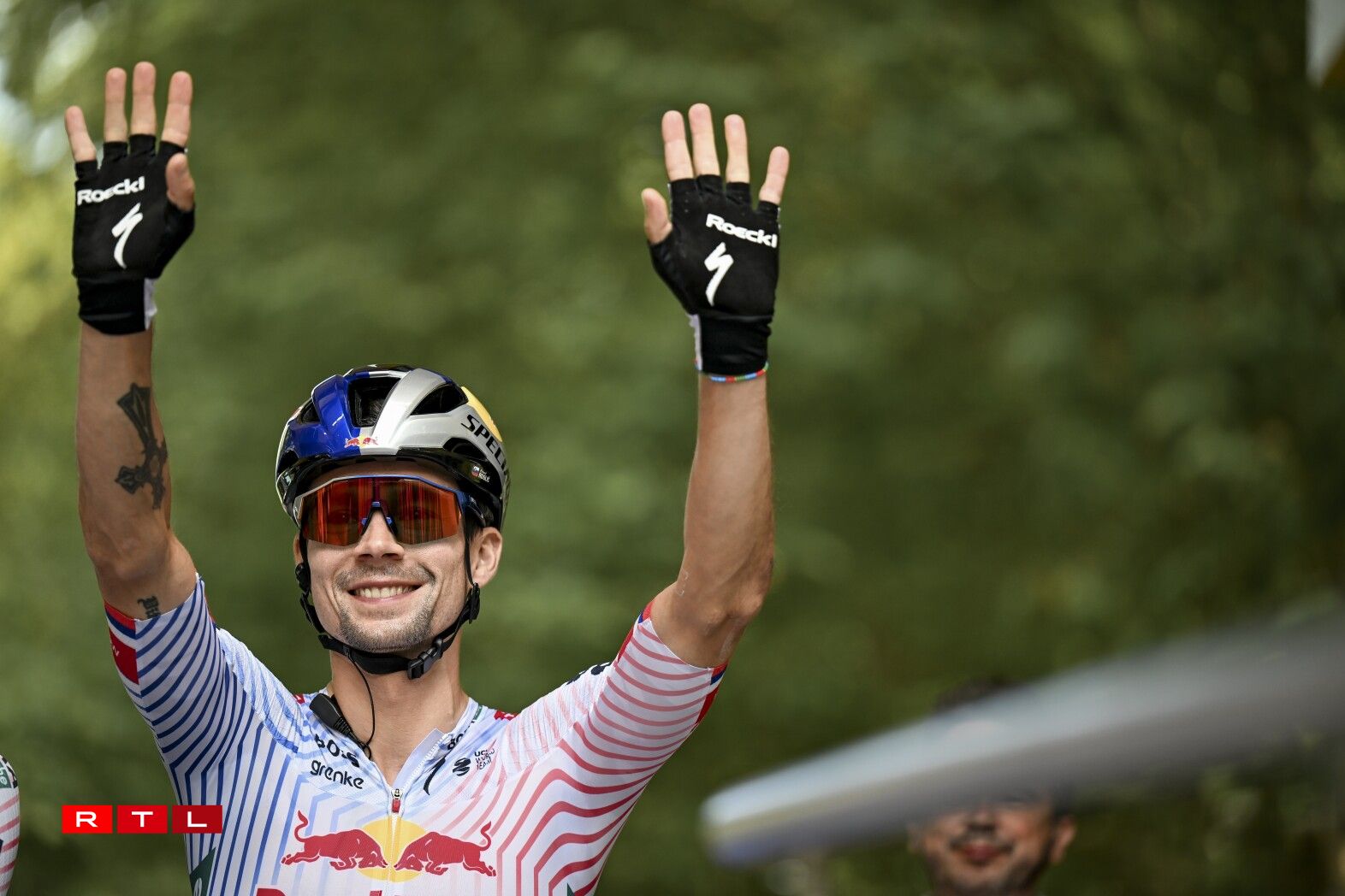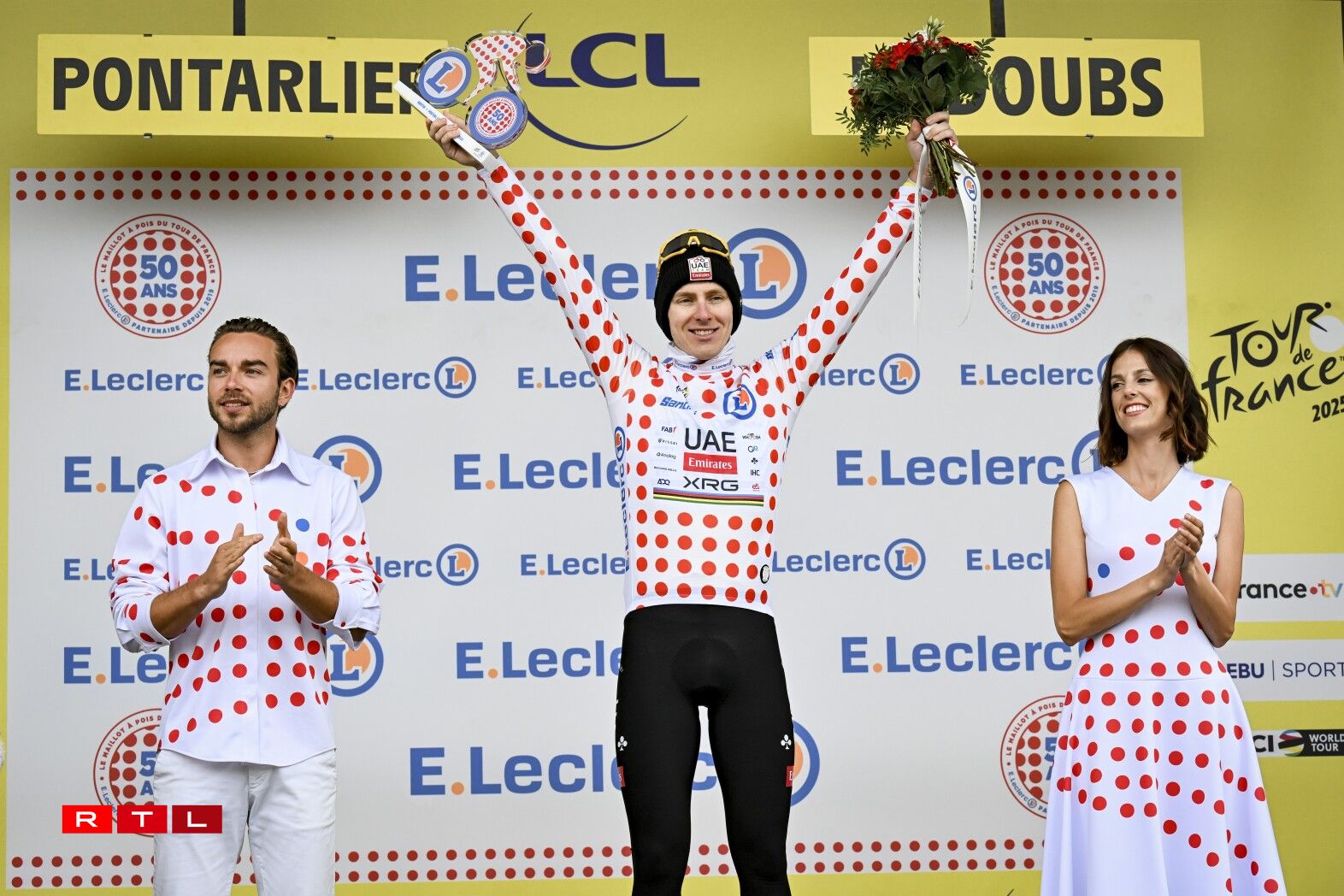 Den Tadej Pogacar steet domadder viru senger véierter Schlussvictoire. Virun der leschter Etapp huet hien eng Avance vu véier Minutten a 24 Sekonnen op de Jonas Vingegaard an eelef Minutten an néng Sekonnen op de Florian Lipowitz.