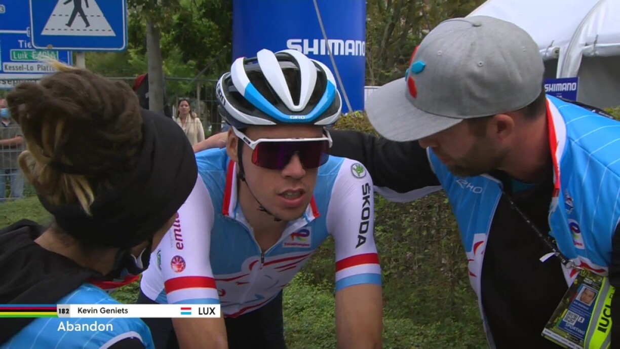 Kee gudden Dag war et e Sonndeg fir de Kevin Geniets bei der Weltmeeschterschaft am Cyclissem. De Lëtzebuerger Champion huet wéinst Mokrämp schonn no 70 Kilometer Course misse vum Vëlo klammen.