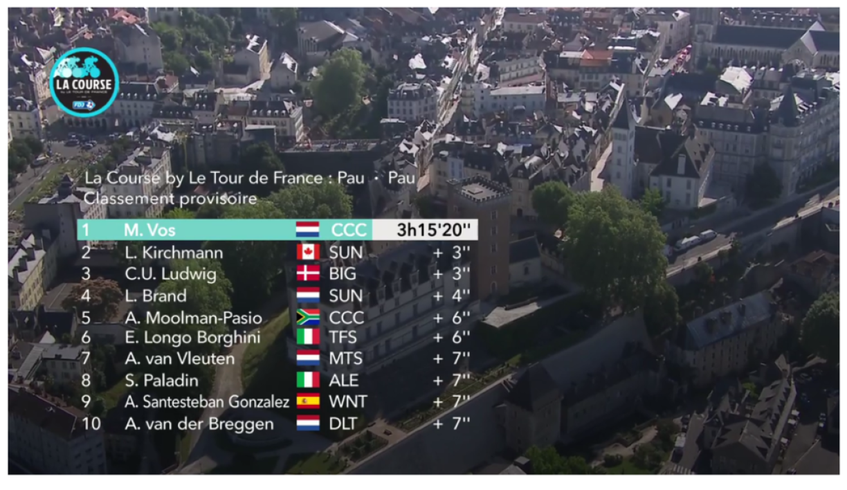 E puer honnert Meter virun der Arrivée war de Peloton esou gutt wéi un der Spëtzt drun. D’Marianne Vos huet mat enger explosiver Attack d’Amanda Spratt agefaangen an alleguerten déi aner Dammen aus dem Peloton distanzéiert, fir dës Course souverän ze gewannen.