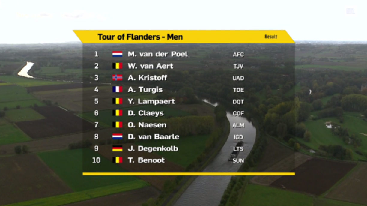 D’Decisioun ëm d’Victoire bei der 104. Editioun vum Tour des Flandres ass e Sonndeg am Sprint tëscht dem Hollänner Mathieu van der Poel an dem Belsch Wout van Aert gefall. De van der Poel war hei een Tick besser a konnt sech eng weider grouss Victoire a senger Karriär sécheren. Hannert dem van Aert ass den Alexander Kristoff deen Drëtte ginn.