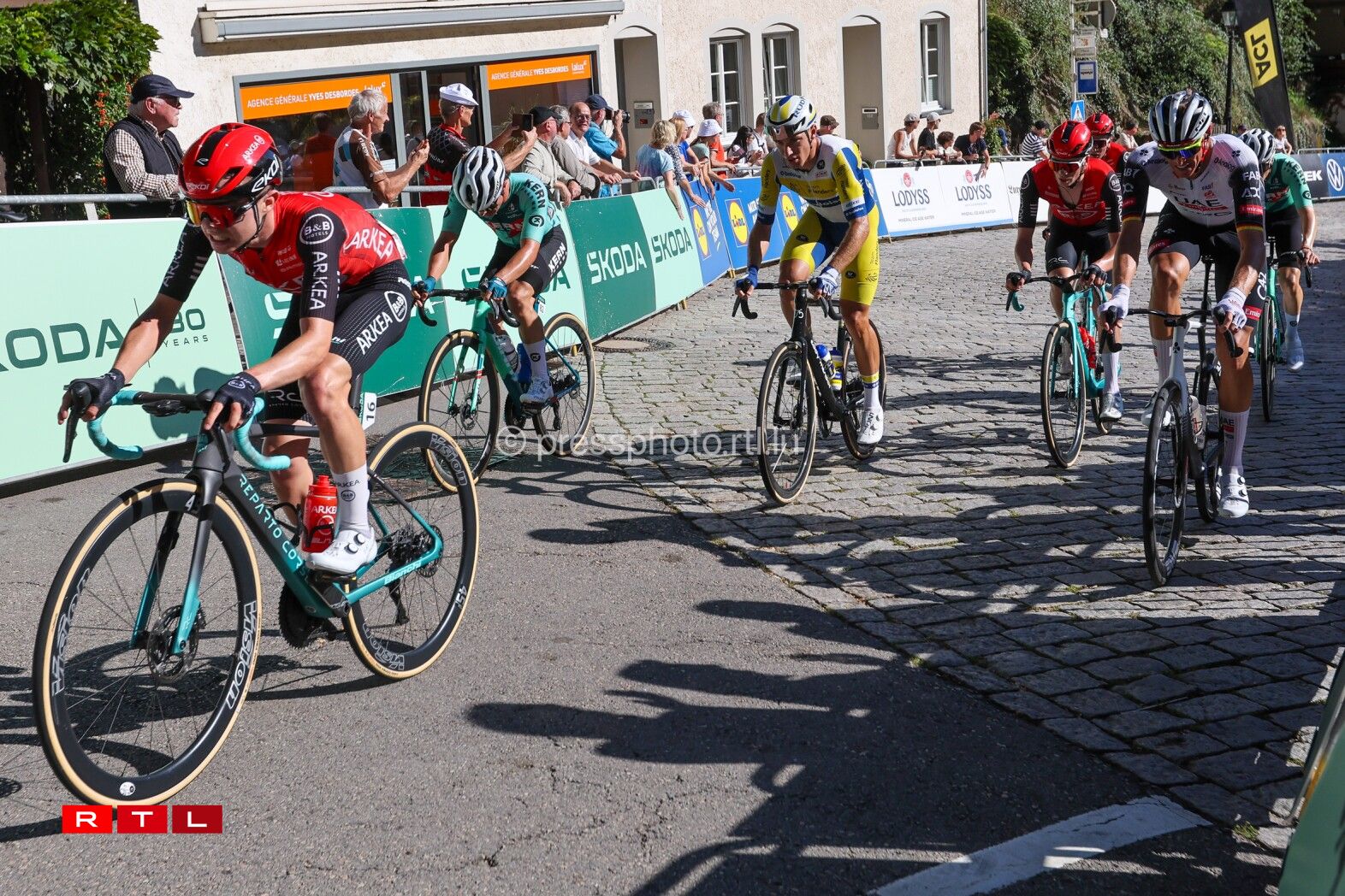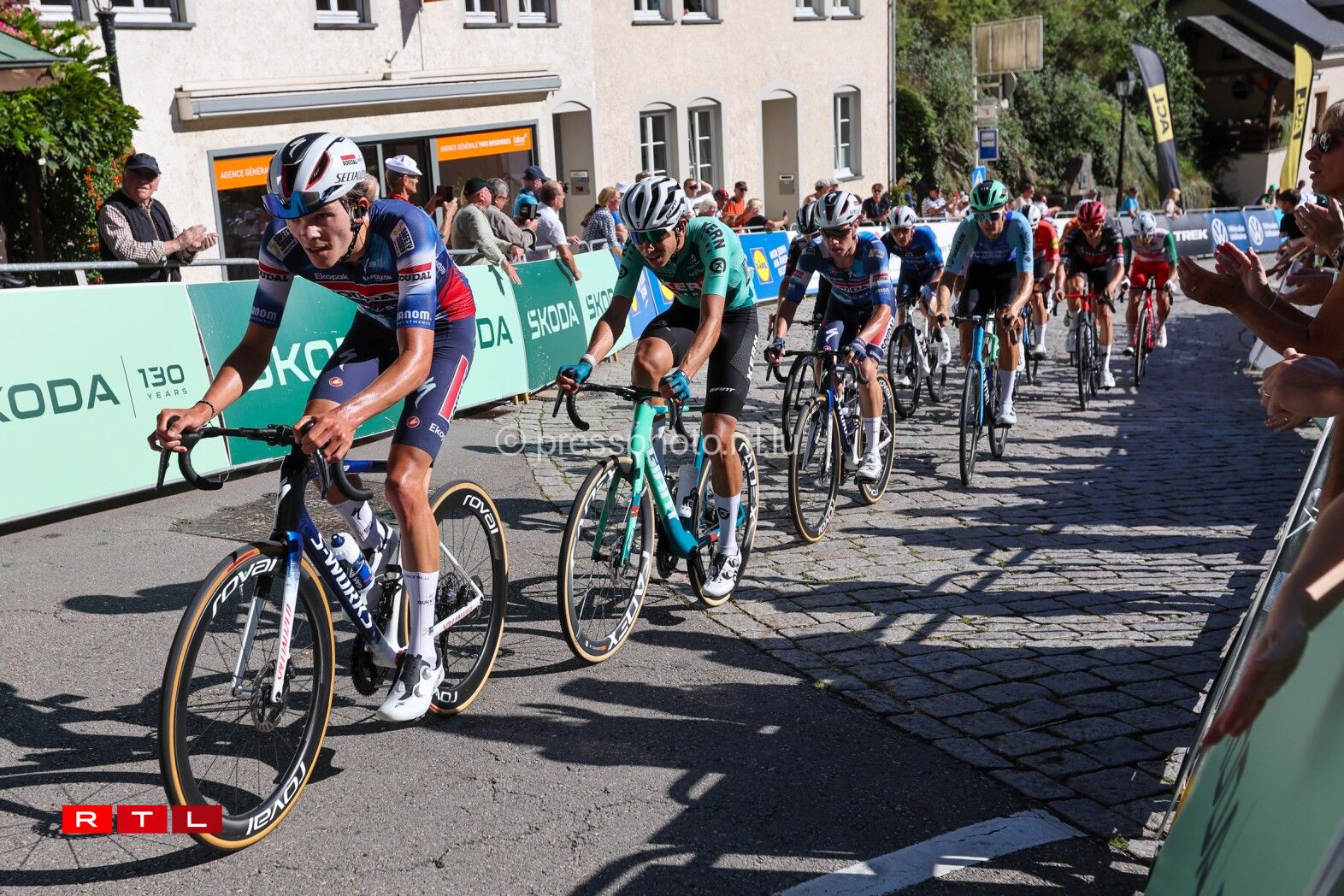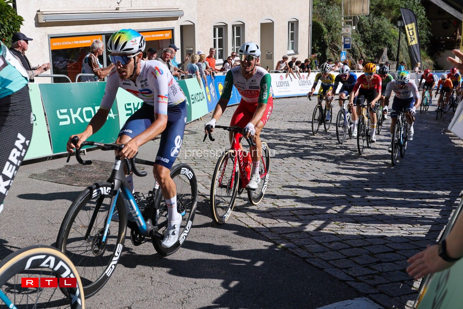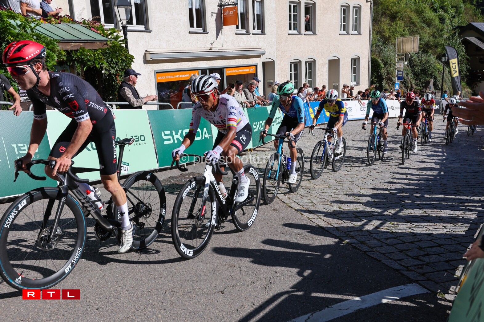 Beim leschte Passage vum Niklosbierg, eng 16 Kilometer virun der Arrivée war du Schluss fir d’Echappée vum Dag. Si si vum Grupp mat de Favoritten agefaange ginn. 9 Coureure sinn un der Spëtzt iwwereg bliwwen: Nicolas Prodhomme, Richard Carapaz, Mattias Skjelmose, Toms Skujins, Brandon McNulty, Jordan Jegat, Marco Brenner, Rafal Majka a Mathys Rondel. An der Descente ass et dem Marc Hirschi, dem Johnatan Narvaez an dem Urko Berrade gelongen, fir nach no vir bäizefueren.