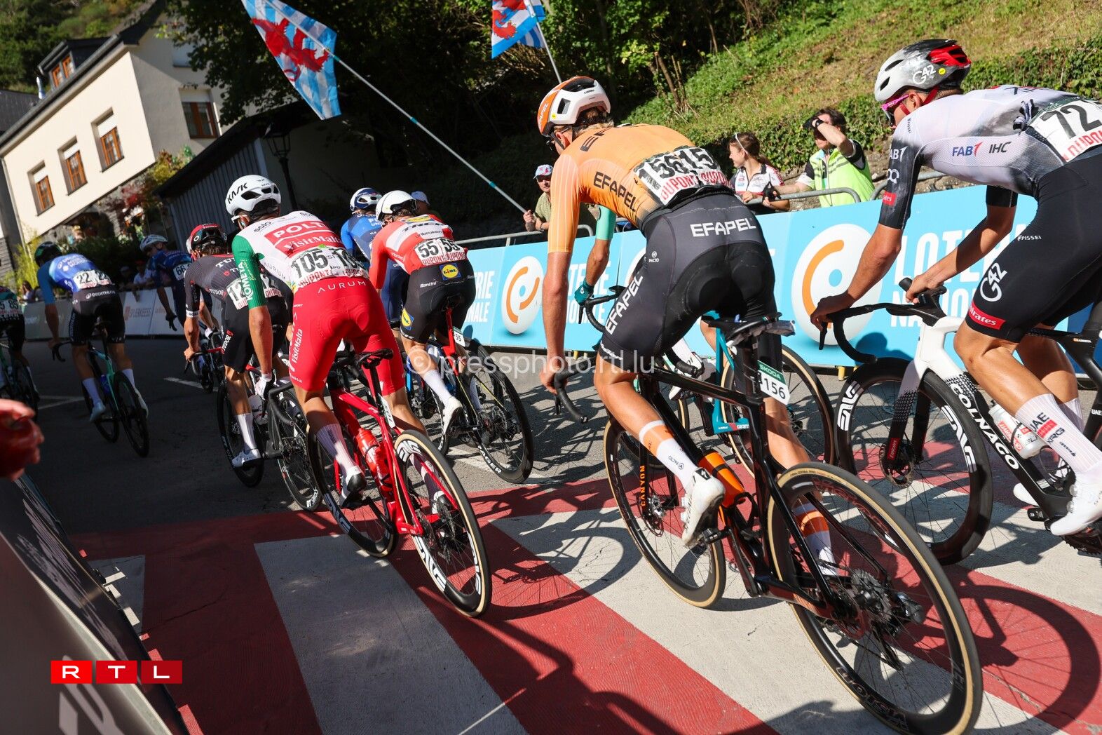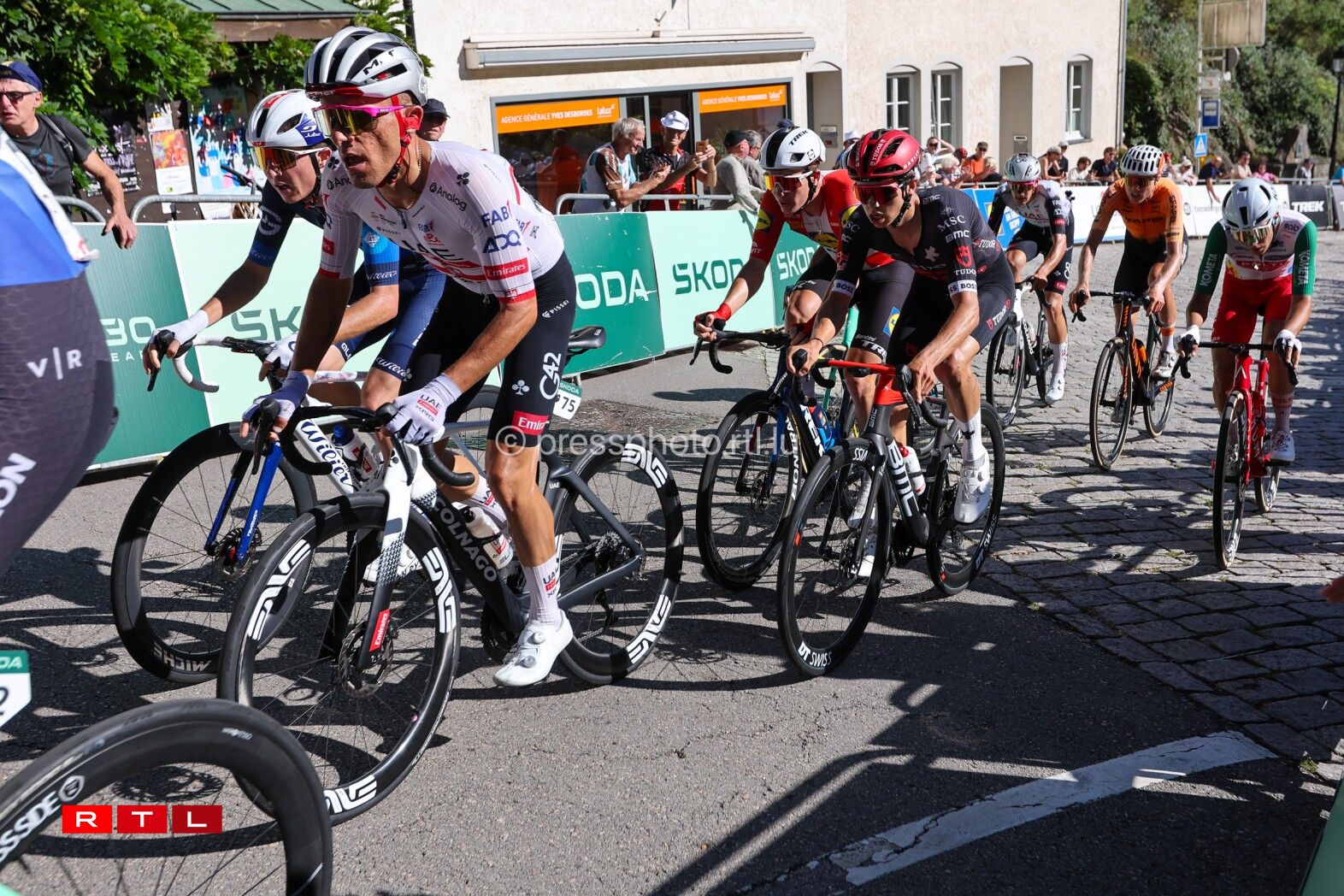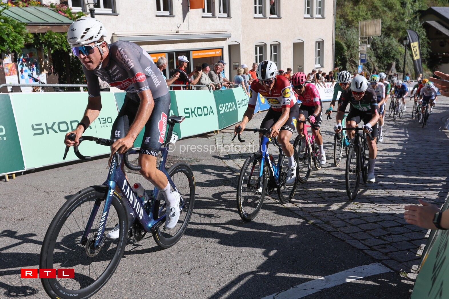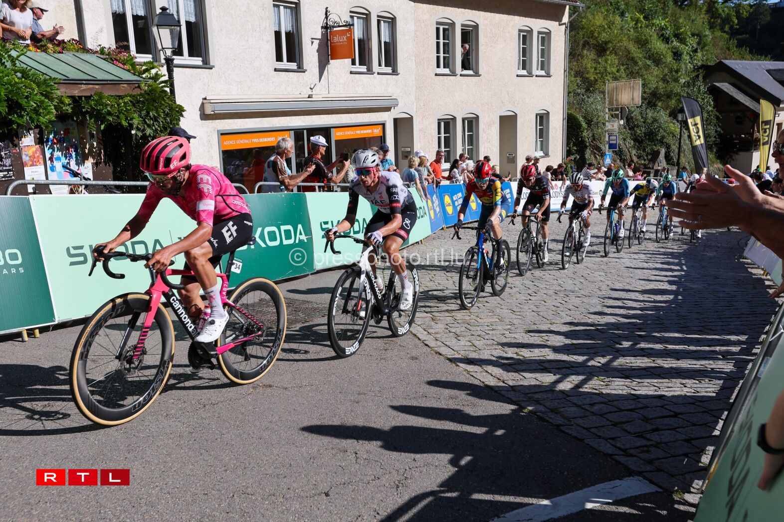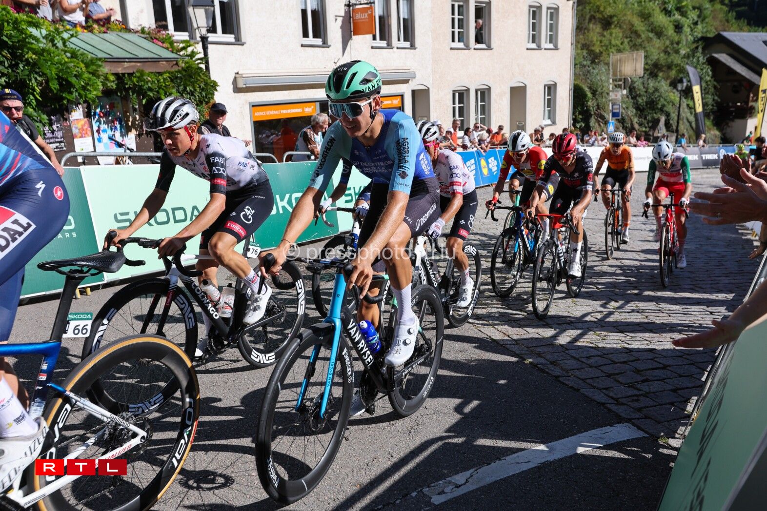 Beim leschte Passage vum Niklosbierg, eng 16 Kilometer virun der Arrivée war du Schluss fir d’Echappée vum Dag. Si si vum Grupp mat de Favoritten agefaange ginn. 9 Coureure sinn un der Spëtzt iwwereg bliwwen: Nicolas Prodhomme, Richard Carapaz, Mattias Skjelmose, Toms Skujins, Brandon McNulty, Jordan Jegat, Marco Brenner, Rafal Majka a Mathys Rondel. An der Descente ass et dem Marc Hirschi, dem Johnatan Narvaez an dem Urko Berrade gelongen, fir nach no vir bäizefueren.