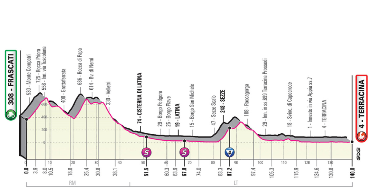 No dräi laangen Deeg um Stéck, stoung um Mëttwoch eng méi kuerz Etapp um Programm. Um 5. Dag ass et iwwer 140 Kilometer vu Frascati op Terracina gaangen. Och wann nëmmen ee Bierg vun der 4. Kategorie bei Kilometer 87 um Programm stoung, war et net ganz esou einfach. Virun allem den Ufank vun der Etapp war hiwweleg an esou stoungen awer nach1200 Héichtemeter um Mëttwoch um Programm.