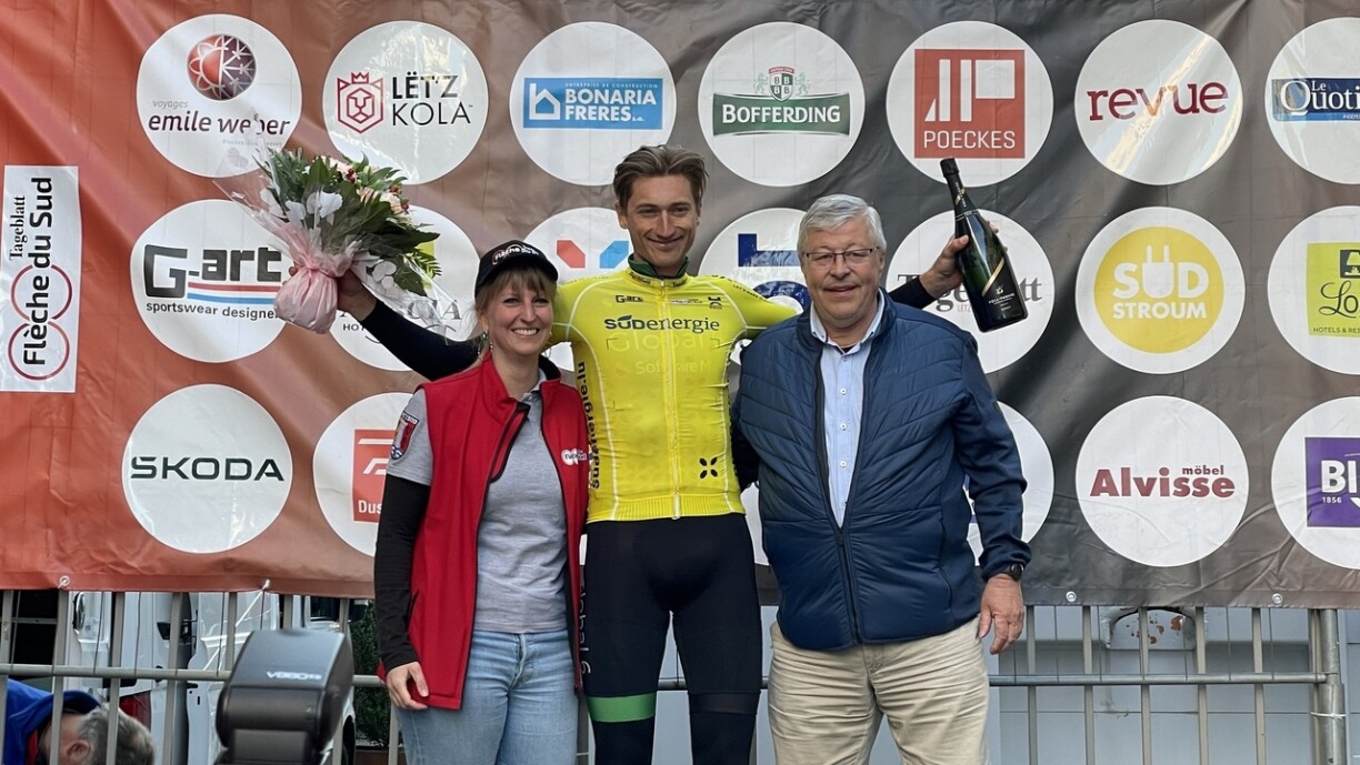 Den Hollänner hat no 3,2 Kilometer 1 Sekonn Avance op de Fransous Lucas Grolier. Den Tom Wirtgen konnt sech als 18. a beschte Lëtzebuerger klasséieren, hien hat e Retard vun 10 Sekonnen.