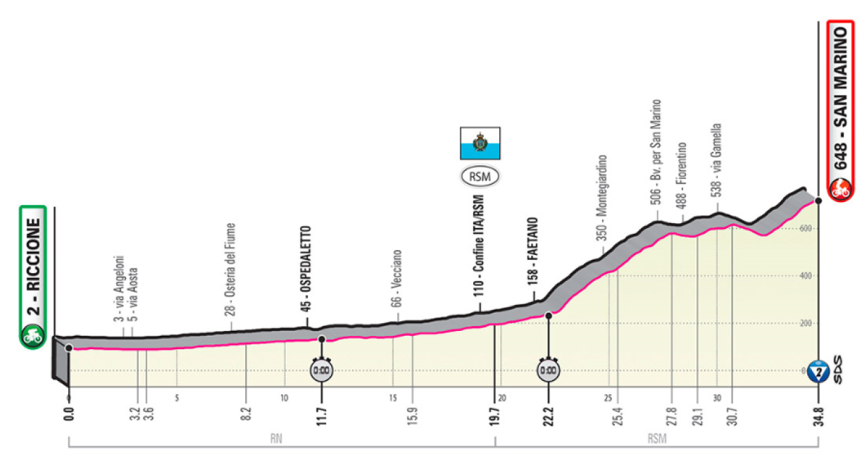 Nom Depart zu Riccione waren déi éischt Kilometer flaach, ier zum Schluss d’Montée erop op San Marino gewaart huet. Gutt 12,2 Kilometer ass et hei emol méi emol manner géi eropgaangen an och eng kleng Descente war dran. Am Duerchschnëtt hat d’Montée 4,5 Prozent mat engem Maximum no 2,8 Kilometer vun 11 Prozent.