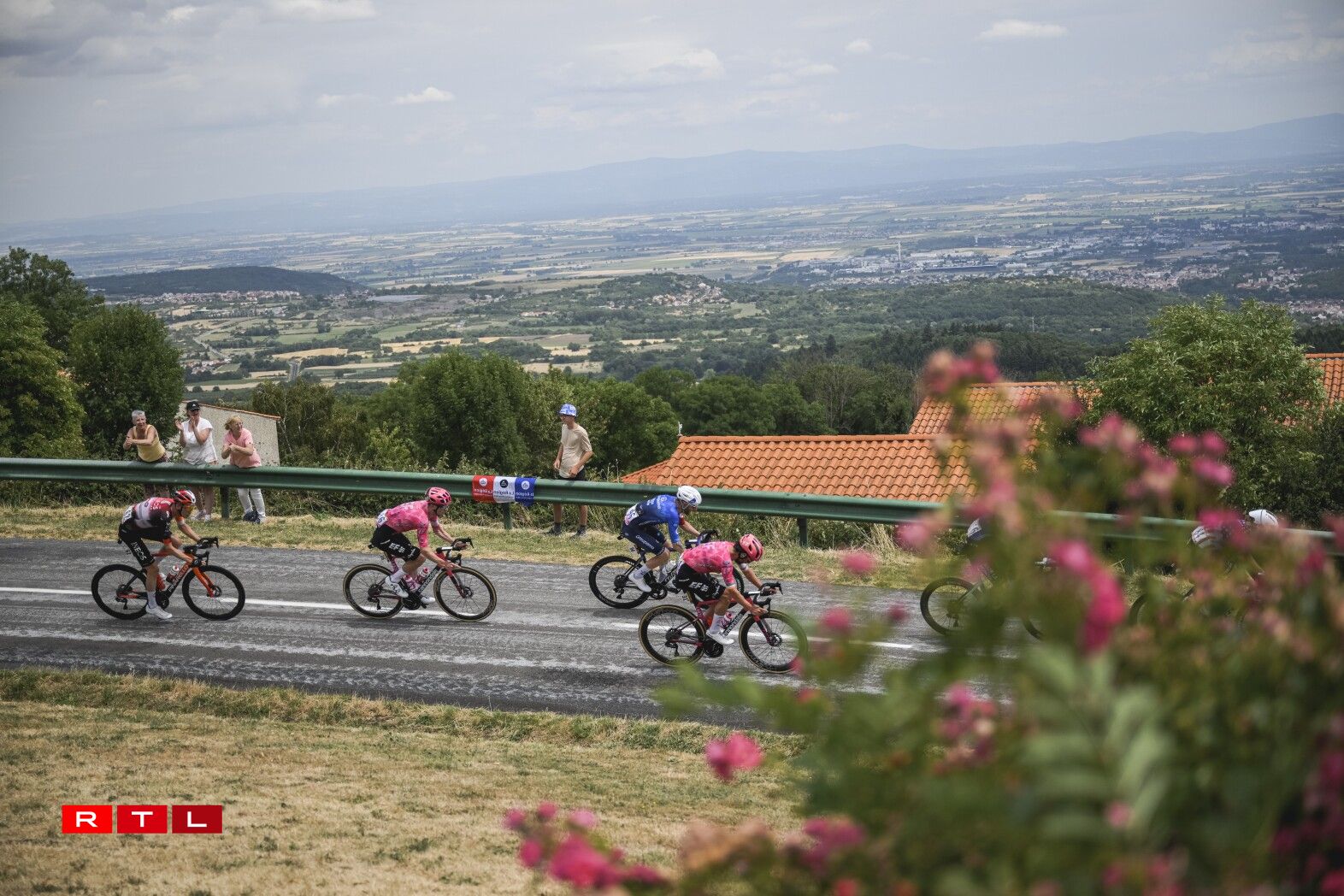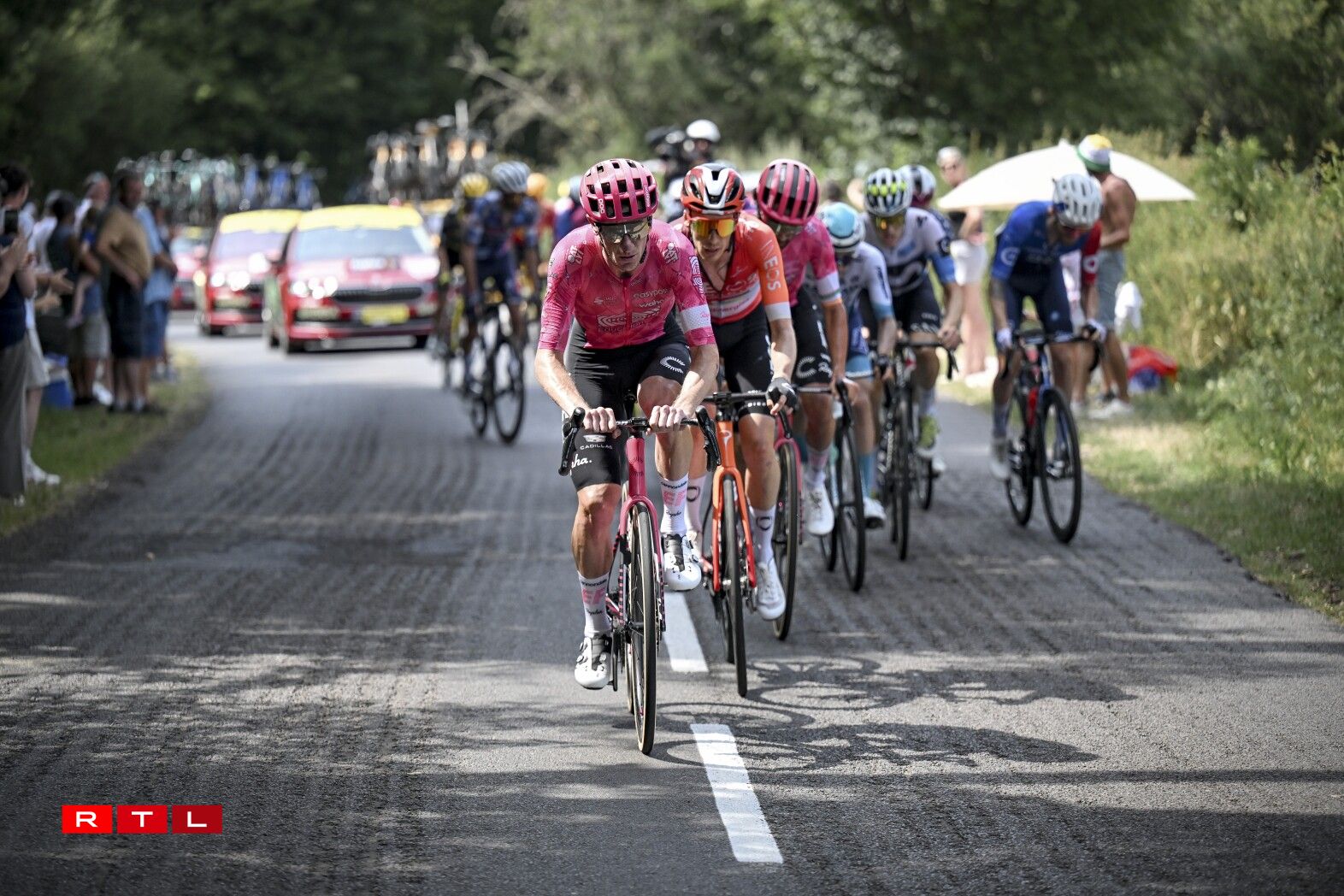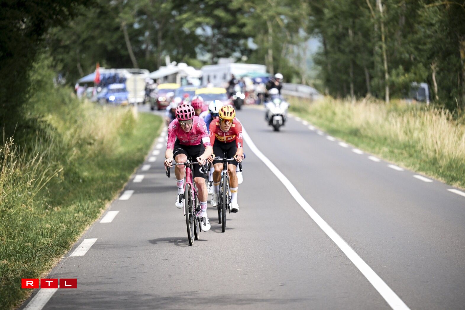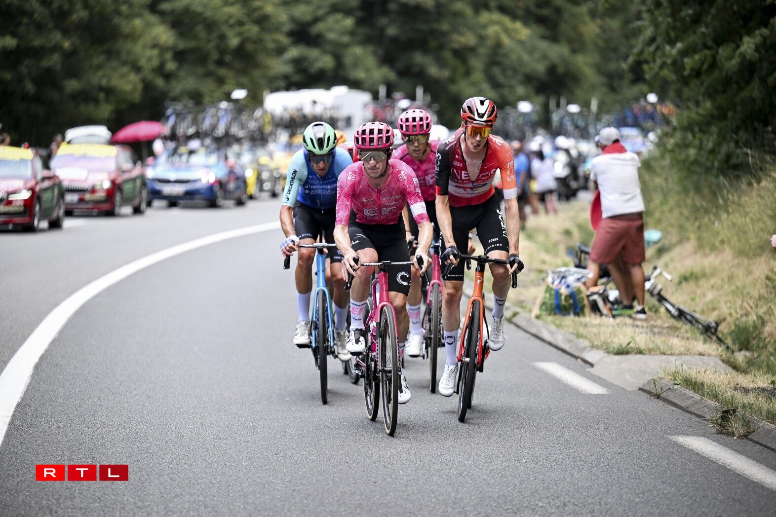 Am Spëtzegrupp goufen et ëmmer rëm Attacken, zum Beispill vum Remco Evenepoel a vum Florian Lipowitz. An der Suite huet den Tadej Pogacar den Tempo ugezunn. De Jonas Vingegaard konnt reagéieren, den Evenepoel gouf distanzéiert. An der Suite huet den Duo Tempo rausgeholl an hat um Enn e Retard vu véier Minutten an 51 Sekonnen op de Simon Yates.