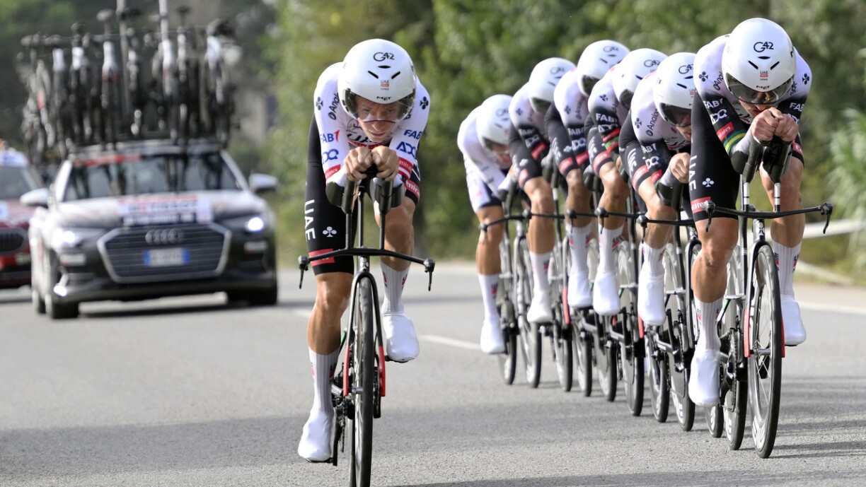 No ronn 24 Kilometer war deemno d’Formatioun UAE am séiersten. D‘Ekipp ronderëm de Spuenier Juan Ayuso hat eng Avance vun 8 Sekonnen op Visma - Lease a Bike mam Jonas Vingegaard.