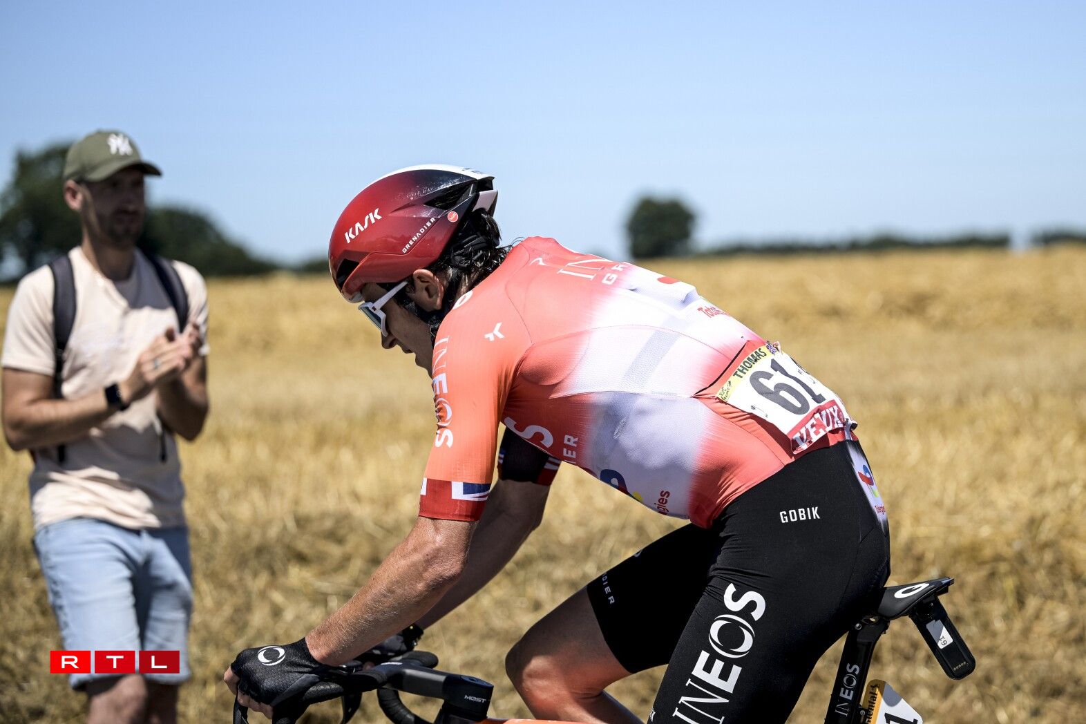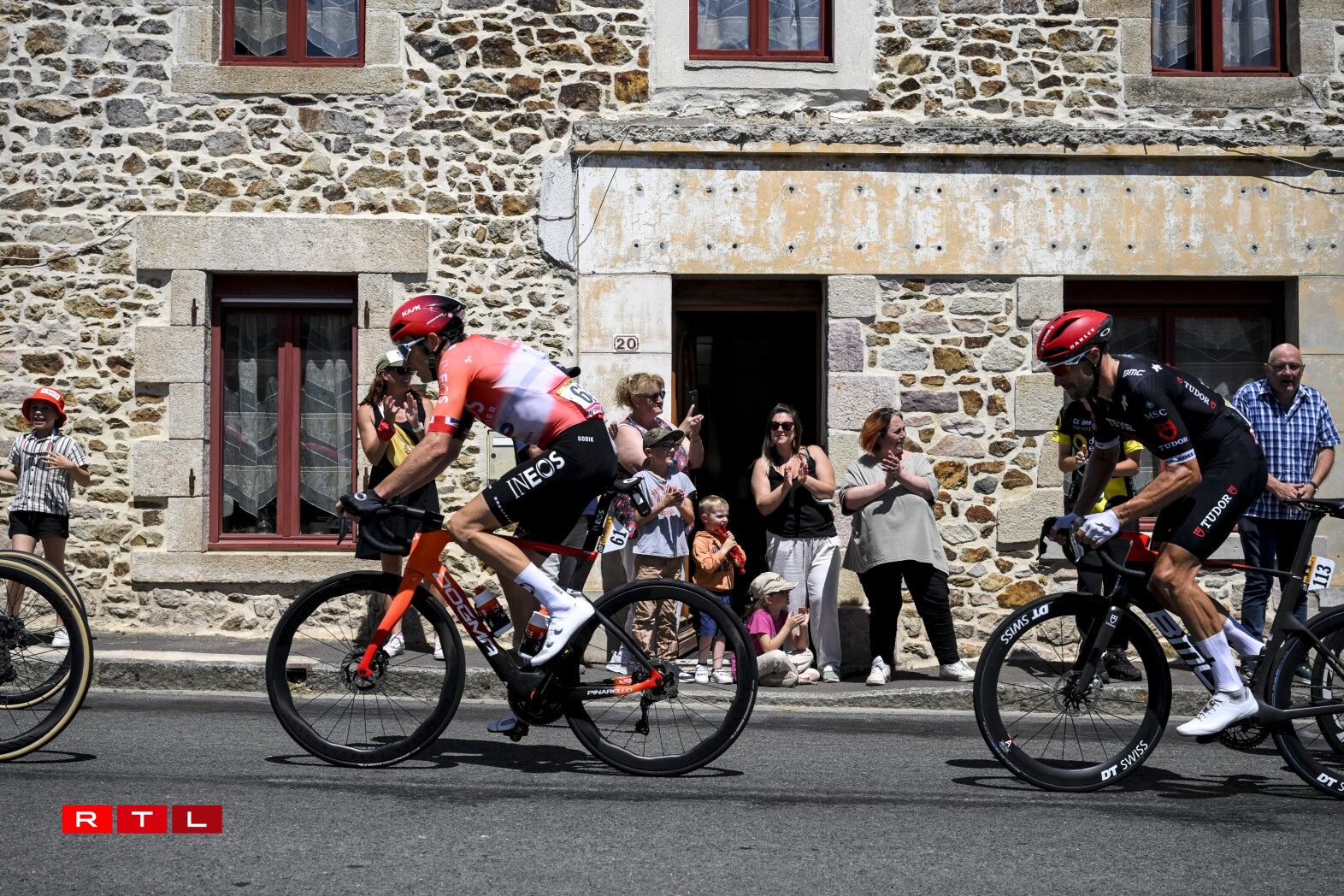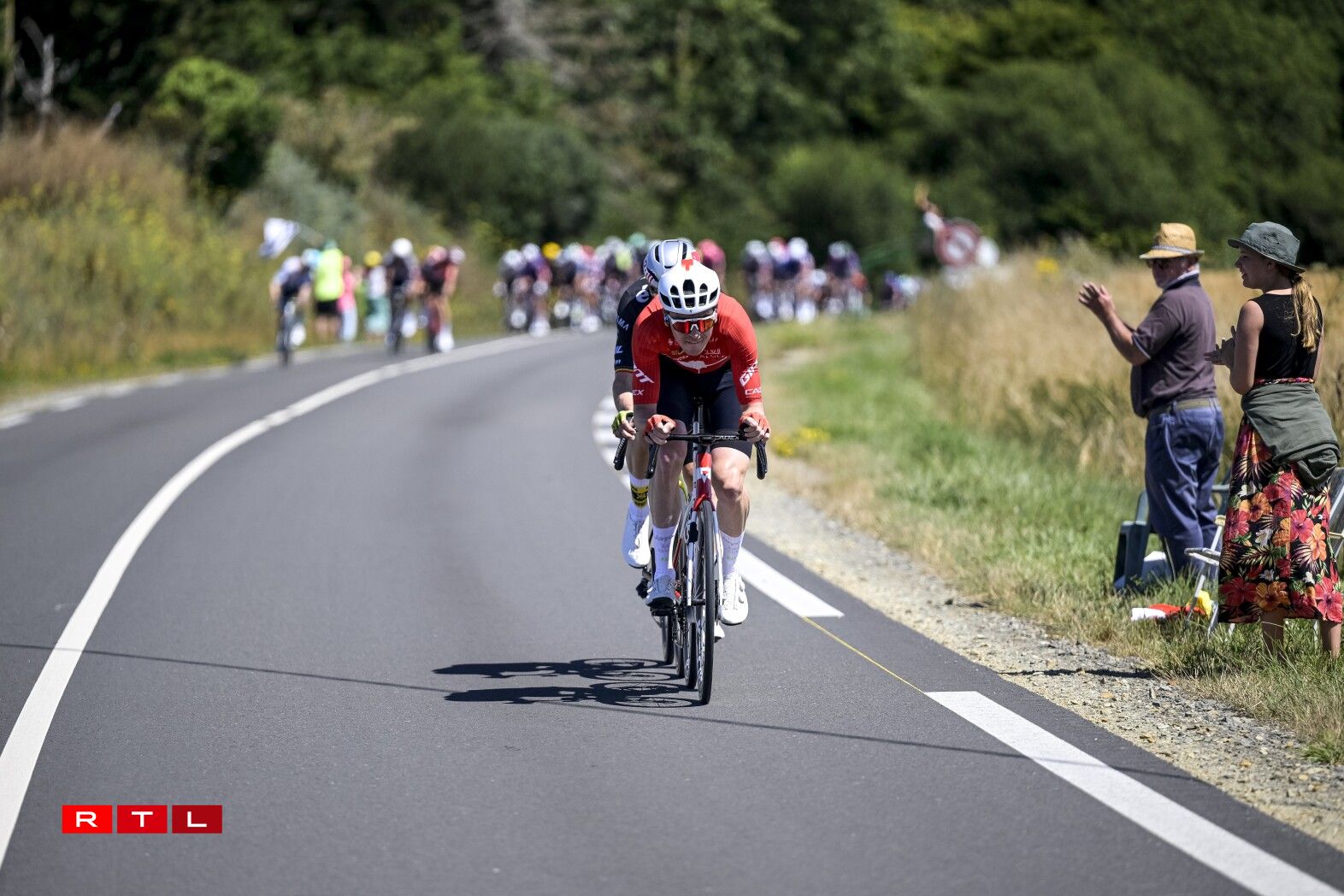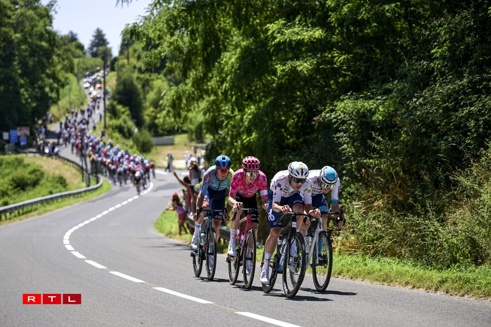 Et huet bis bei Kilometer 55 gedauert, bis d‘Echappée vum Dag sech forméiert hat. An där ware 5 Leit dran: den Alex Baudin, de fréieren Tour de France Gewënner Geraint Thomas, de Marco Haller, den Ewen Costiou an den Ivan Garcia Cortina. D‘Avance vun dësem Grupp ass awer just op knapps 2 Minutten erop gaangen. Den Train am Peloton hunn haaptsächlech d‘Ekipp Alpecin-Deceuninck vum Maillot Jaune Mathieu van der Poel assuréiert, an UAE vum Tadej Pogacar.