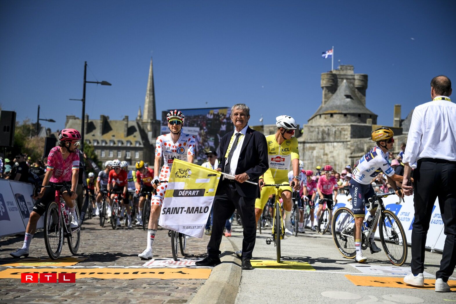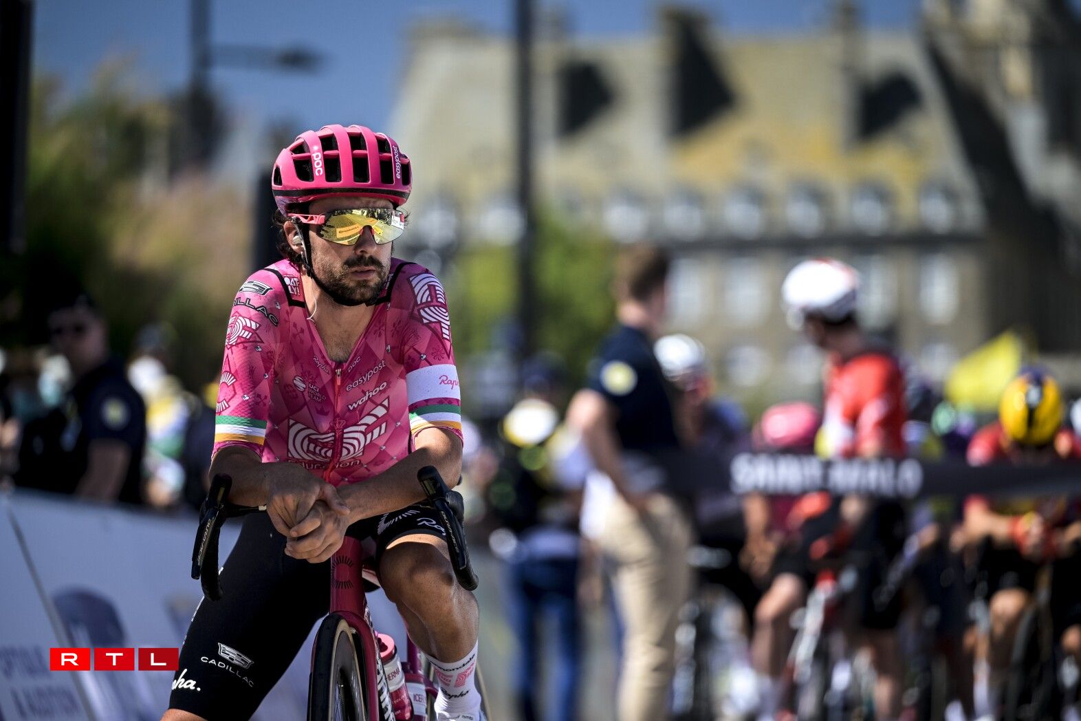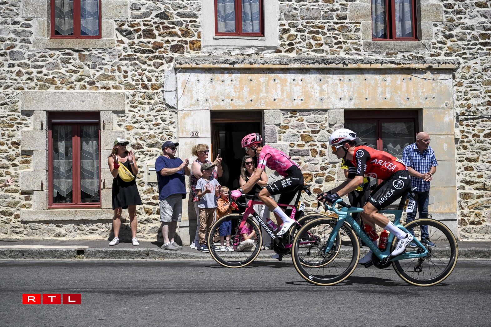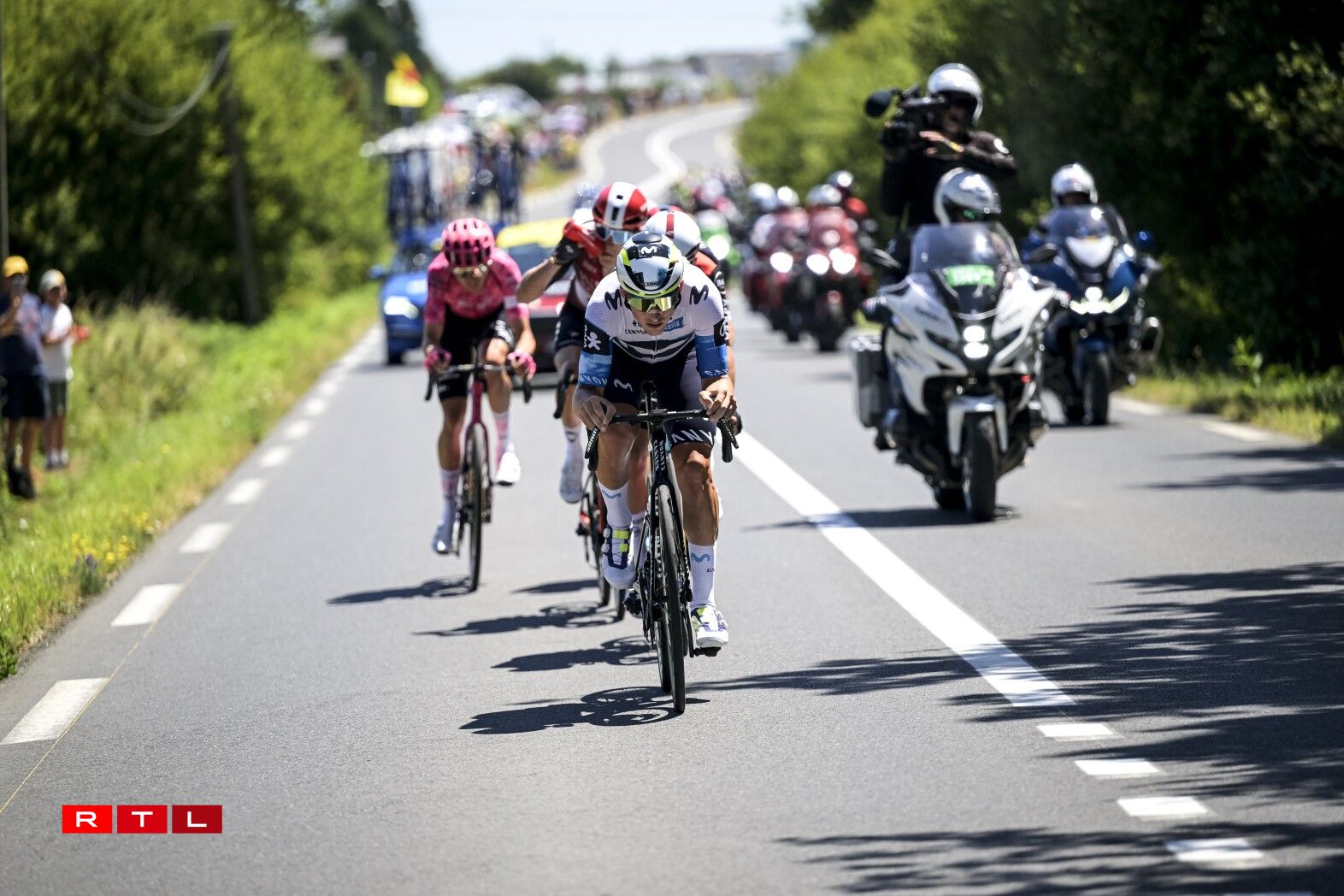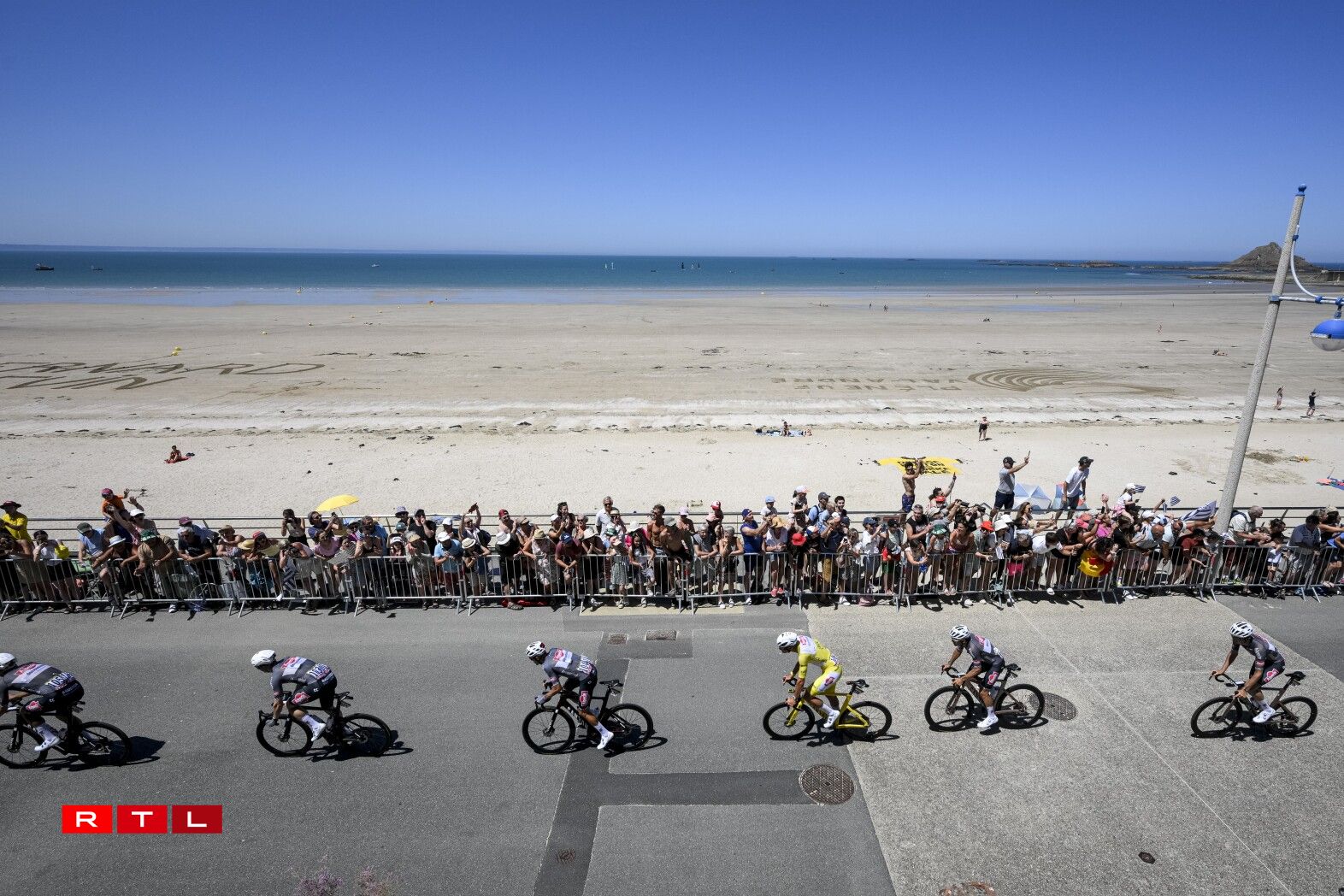 Et huet bis bei Kilometer 55 gedauert, bis d‘Echappée vum Dag sech forméiert hat. An där ware 5 Leit dran: den Alex Baudin, de fréieren Tour de France Gewënner Geraint Thomas, de Marco Haller, den Ewen Costiou an den Ivan Garcia Cortina. D‘Avance vun dësem Grupp ass awer just op knapps 2 Minutten erop gaangen. Den Train am Peloton hunn haaptsächlech d‘Ekipp Alpecin-Deceuninck vum Maillot Jaune Mathieu van der Poel assuréiert, an UAE vum Tadej Pogacar.