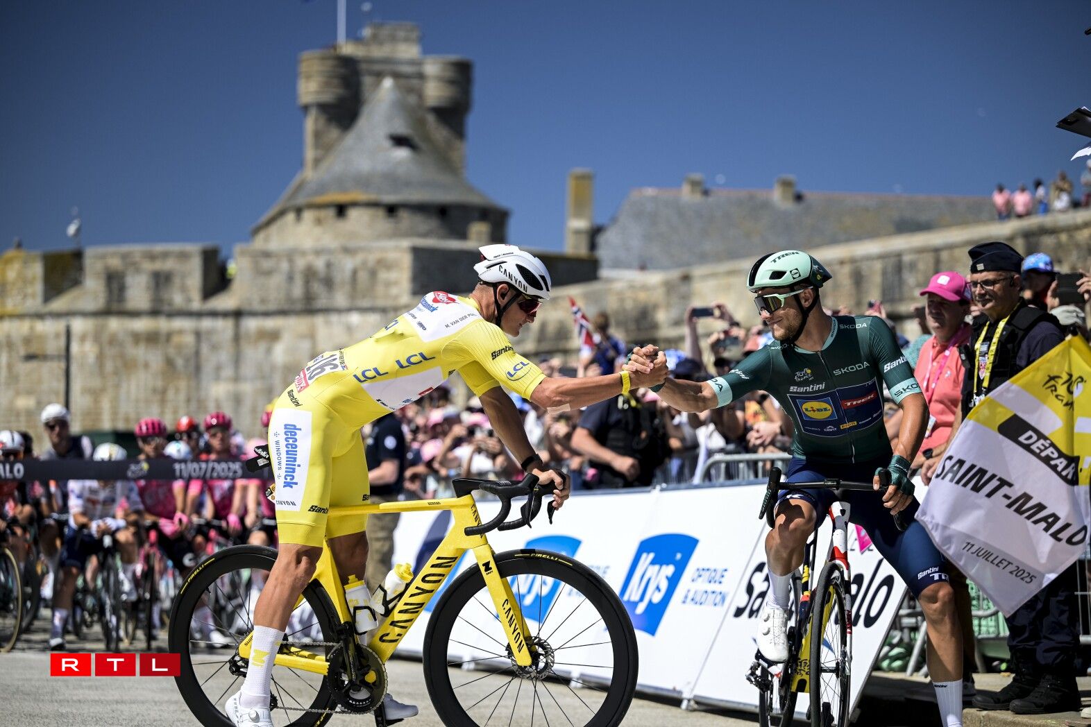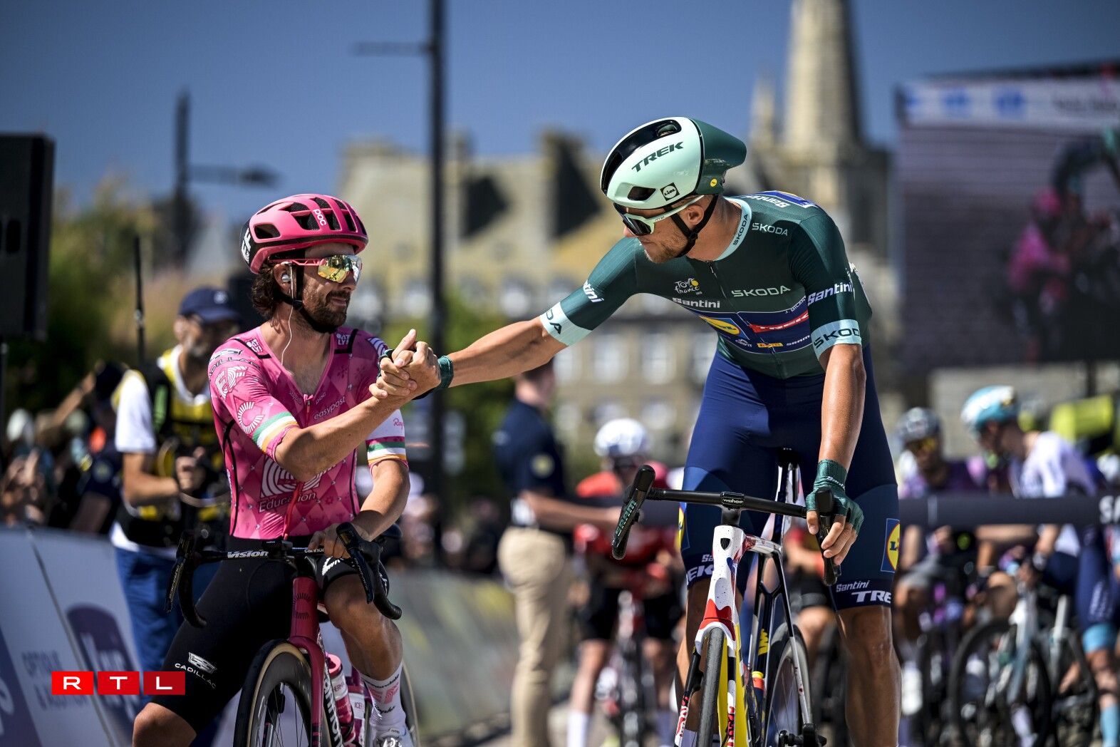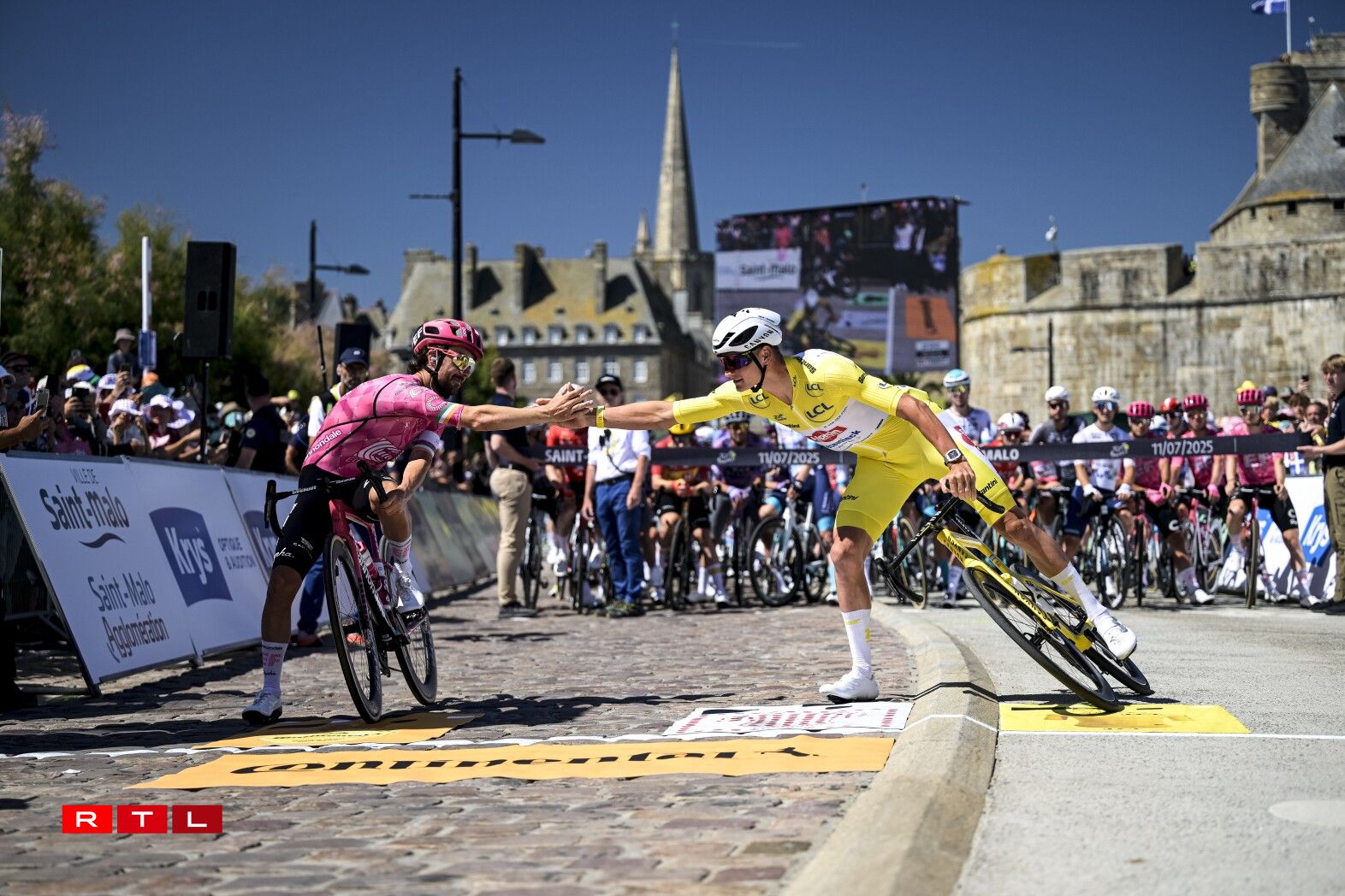 De Weltmeeschter Tadej Pogacar huet sech uewen zu Mûr-de-Bretagne, knapps géint de Jonas Vingaard behaapt. De Slowen iwwerhëlt elo och nees de Maillot Jaune. Hien huet 54 Sekonnen Avance op de Remco Evenepoel.