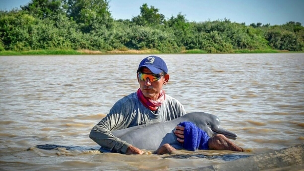 Eng Rettungsaktioun gouf am Floss Meta am Oste vum Land, no un der Grenz zu Venezuela lancéiert. E Grupp Experten huet déi ronn 140 Kilogramm schwéier Delfin-Mamm an dat ronn 35 Kilo schwéiert Jongdéier aus dem Floss gehuewen an hu se no enger Ënnersichung an déiwem Waasser nees fräi gelooss. Souwuel Sécherheetsekippe wéi och Leit vun der Ëmweltorganisatioun Fundación Omacha an Netregierungsorganisatioune waren un der Rettungsaktioun bedeelegt.